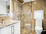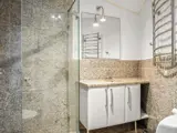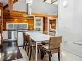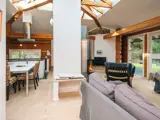 Der Innenbereich des Blockhauses bietet Platz für sieben Personen und verfügt über drei Badezimmer, alle mit exklusiven Materialien wie Marmorwaschbecken und Steinoberflächen ausgestattet. Das Haupthaus ist um ein zentrales Wohnzimmer mit Kamin, großen Fenstern und einer einzigartigen Beleuchtung herum gebaut, die eine warme und einladende Atmosphäre schafft. Die Küche ist mit schwarzen Steinoberflächen und Massivholz gestaltet und harmoniert mit den hochwertigen Materialien des restlichen Hauses. Die beiden Flügel des Haupthauses verfügen jeweils über eine eigene Suite mit eigenem Schlafzimmer und Badezimmer, während der dritte Flügel über ein zusätzliches Gästezimmer verfügt. Um den Mietern optimalen Komfort zu bieten, ist das Haus mit 7 hochwertigen Betten mit den Maßen 90 x 200 cm ausgestattet.
