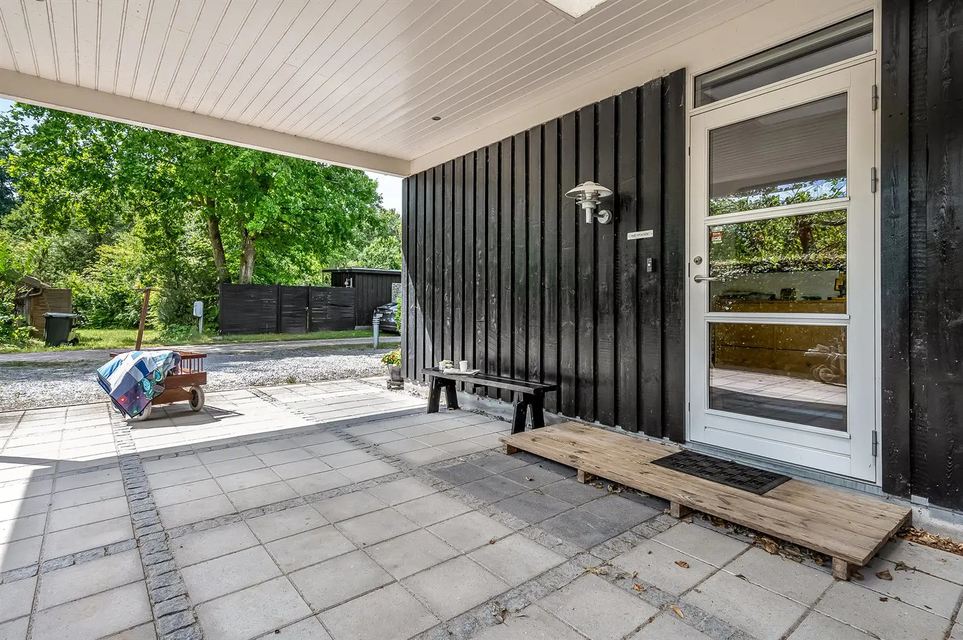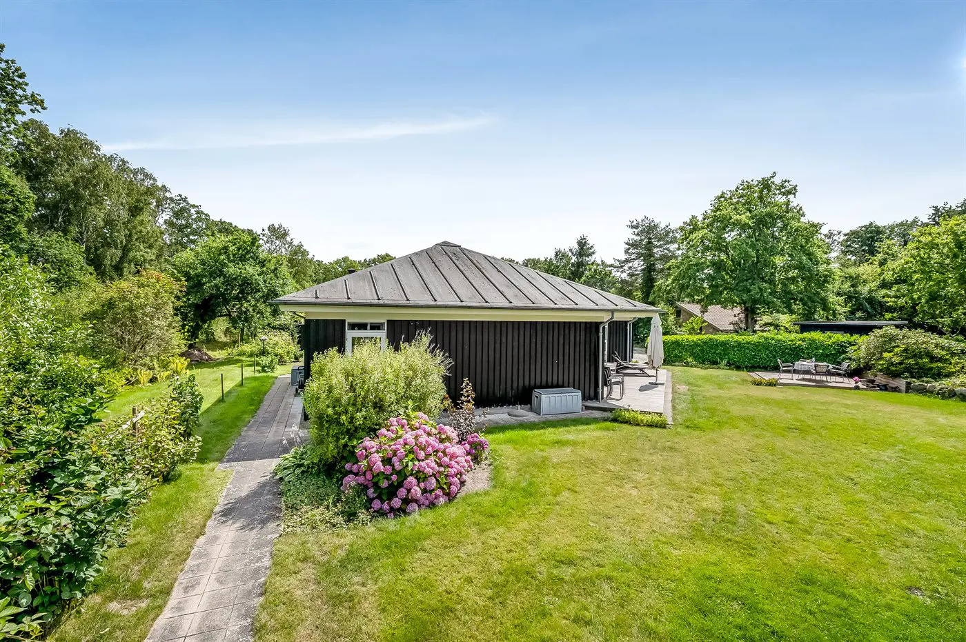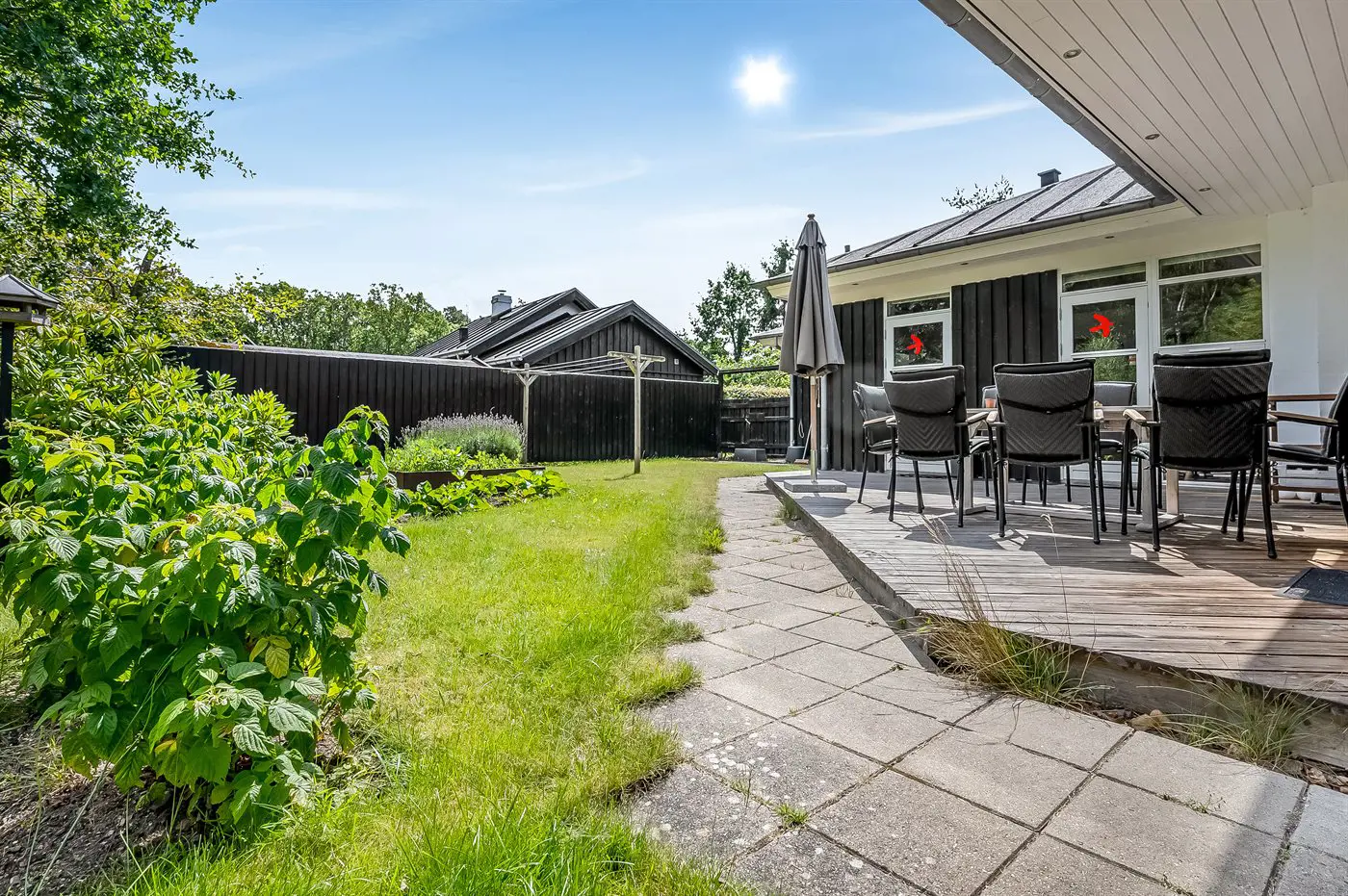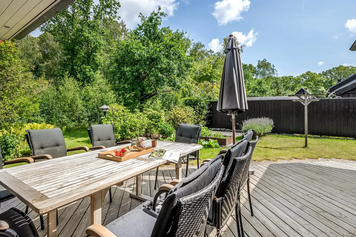 Das Haus verfügt über drei gute Schlafzimmer mit vollwertigen Doppelbetten, die auf zwei separate Schlaf-Abteilungen verteilt sind. Zu beiden Abteilungen gehört jeweils ein eigenes Badezimmer. Es gibt ein schönes, großes Wohnzimmer, und du hast von fast jedem Raum aus Zugang zur Terrasse. Die gut ausgestattete Küche ist mit dem Essbereich kombiniert, von wo aus du ebenfalls direkt auf die schöne Terrasse mit Blick in den gepflegten, privaten Garten gelangst.