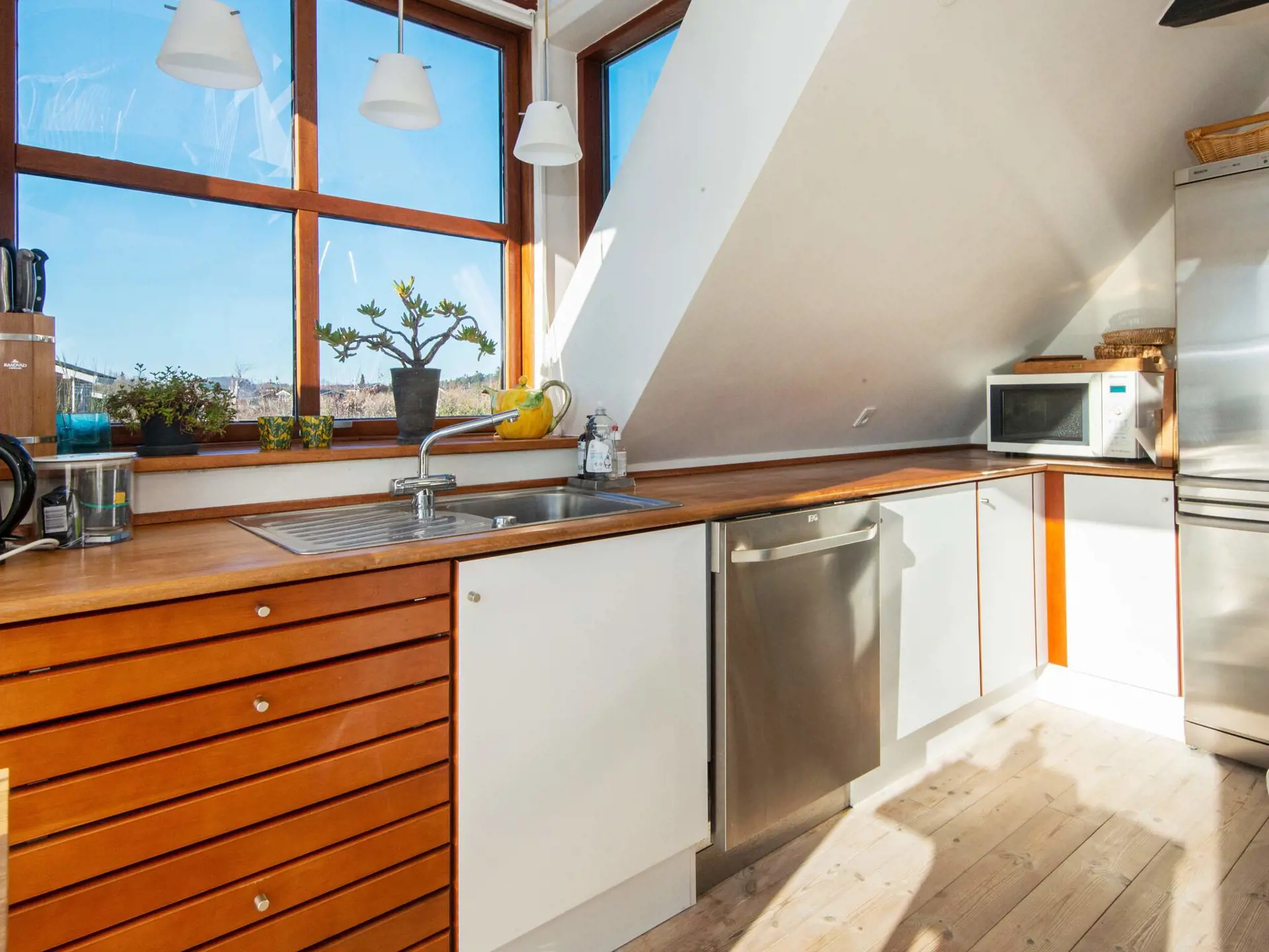 Die offen in den Wohnbereich integrierte Küche ist ein Plus für das Familienleben. Von dort gelangt man auch in die obere Etage, wo die Aussicht noch besser ist. Zum Haus gehört auch eine Holzveranda, wo man gut abgeschirmt Platz nehmen und sich entspannen kann. Kinder freuen sich bestimmt über die Schaukel auf dem Grundstück. An Sommerabenden kann im Garten gegrillt werden.