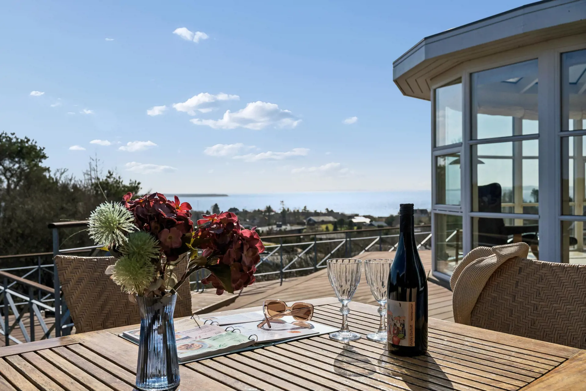 Das Herzstück des Hauses ist das gemütliche, abgesenkte Wohnzimmer mit komfortablen Möbeln und Kaminofen. Von hier aus haben Sie direkten Zugang zu einer schönen Terrasse mit Gartenmöbeln, von der aus Sie einen fantastischen Blick auf das Wasser genießen können.