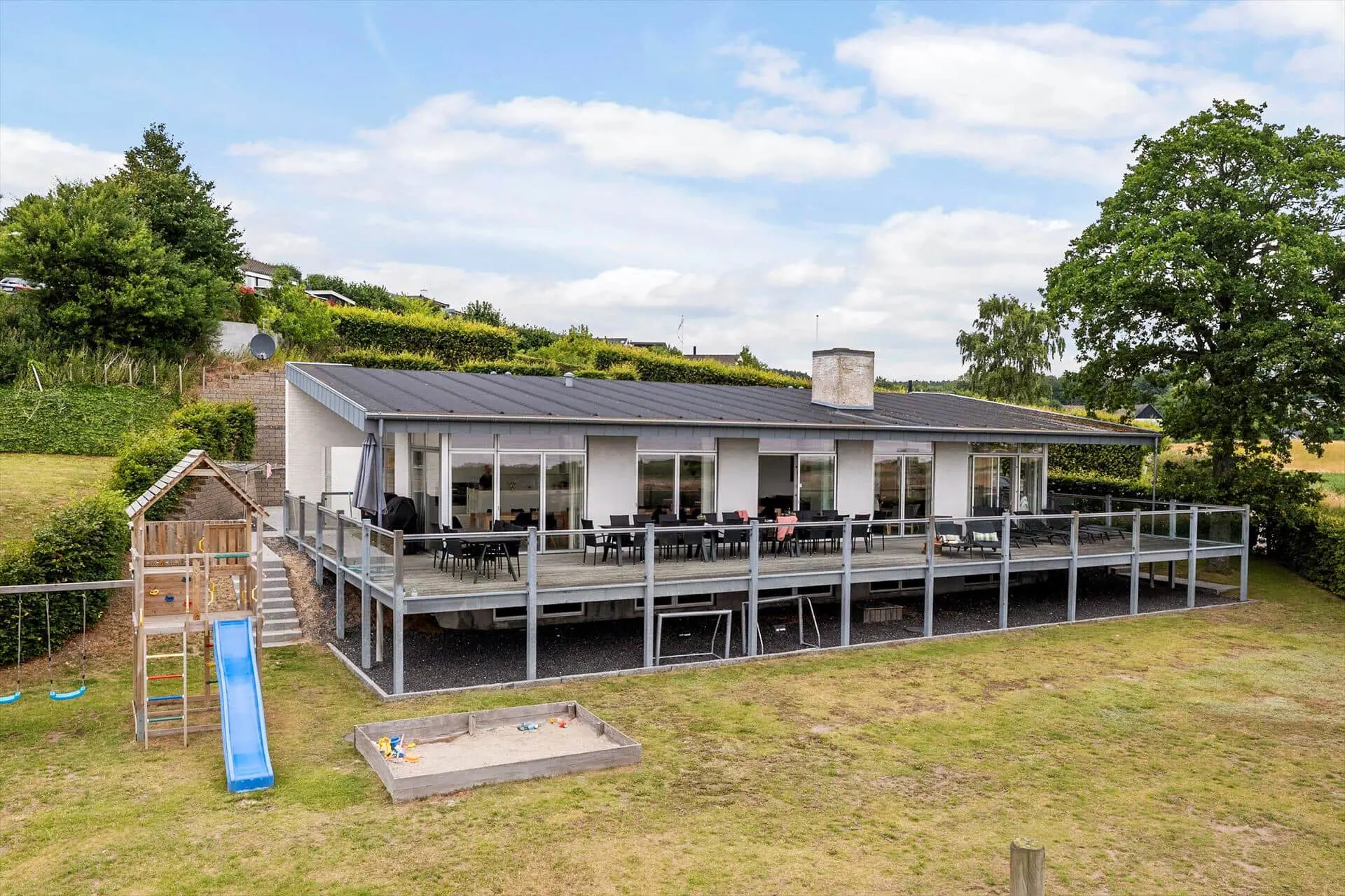 Unter freiem Himmel geht es bei diesem Ferienhaus mindestens genauso schön zu, wie im Haus selbst. Du darfst dich auf eine schöne, große Terrasse freuen, auf der du die Sonne und den Blick auf das Meer in vollen Zügen genießen kannst. Mache es dir in aller Ruhe auf einer der Gartenliegen gemütlich und lasse die Seele baumeln, nehme ein spannendes Buch zur Hand oder bereite alles für ein köstliches Abendessen vom Grill zu. Der Garten bietet deinen Kindern angenehm viel Platz zum Spielen. Zudem verwöhnt er mit kleinen, gemütlichen Eckchen, die es dir ermöglichen, dich in aller Ruhe ein wenig zurückzuziehen. Die tolle Lage deines Urlaubsdomizils bedingt einen uneingeschränkten Blick auf das Wasser. Lediglich zwei Minuten trennen dich und deine Lieben vom Strand - perfekt, um jeden Tag mit einem erfrischenden Bad in den wogenden Wellen zu begrüßen und mit einem Strandspaziergang im Abendlicht ausklingen zu lassen.