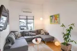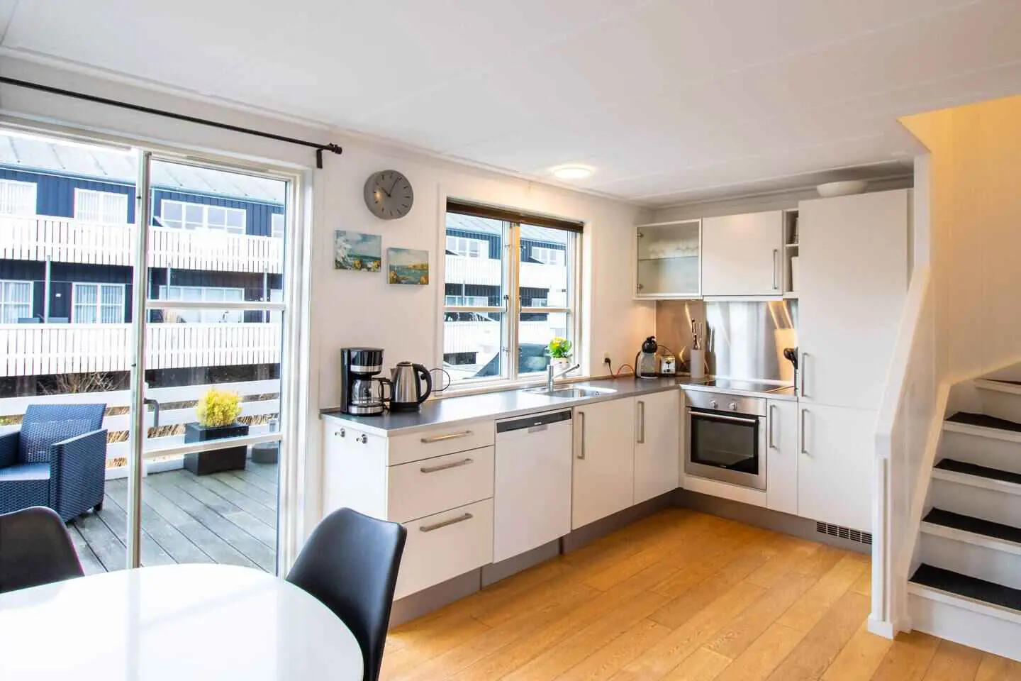 Innen erwarten Sie ein Eingangsbereich, ein geräumiges Bad und ein offener Wohnraum mit voll ausgestatteter Küche. Das Wohnzimmer führt zur eingezäunten Terrasse und zum Vorgarten – ideal für Kinder und entspanntes Beisammensein.