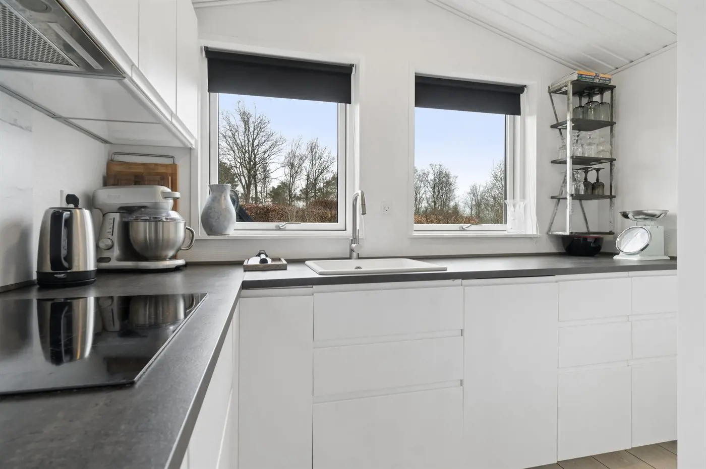 Die Küche ist mit Kühlschrank ausgestattet. Außerdem gibt es 4 Induktions-Kochzonen, Umluftofen, Mikrowelle sowie Geschirrspüler.