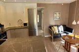 Die Küche ist mit Kühlschrank ausgestattet. Außerdem gibt es 4 Induktions-Kochzonen, Umluftofen, Mikrowelle, Airfryer sowie Geschirrspüler.