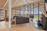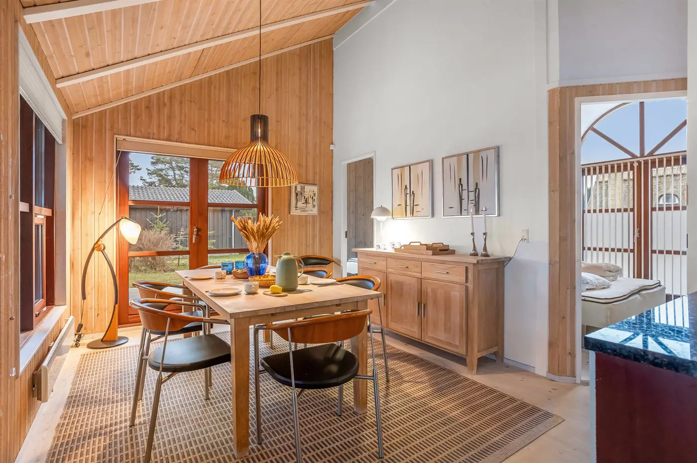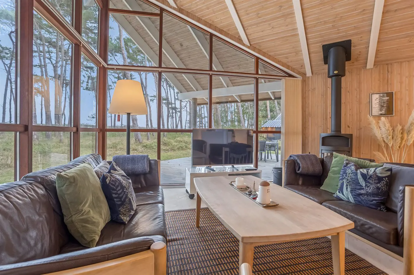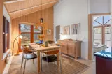 Im Inneren erwartet euch ein helles und großzügiges Wohn- und Esszimmer mit offener Küche, Decke bis zum First und großen Fensterfronten, die dafür sorgen, dass ihr das Licht und die Landschaft hautnah erleben könnt. Die offene Küche ist gut ausgestattet, und der Wohnbereich lädt mit großem Kaminofen, kostenlosem WLAN sowie TV mit internationalen Kanälen zum Entspannen ein.