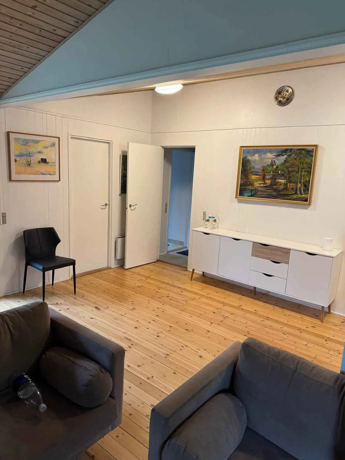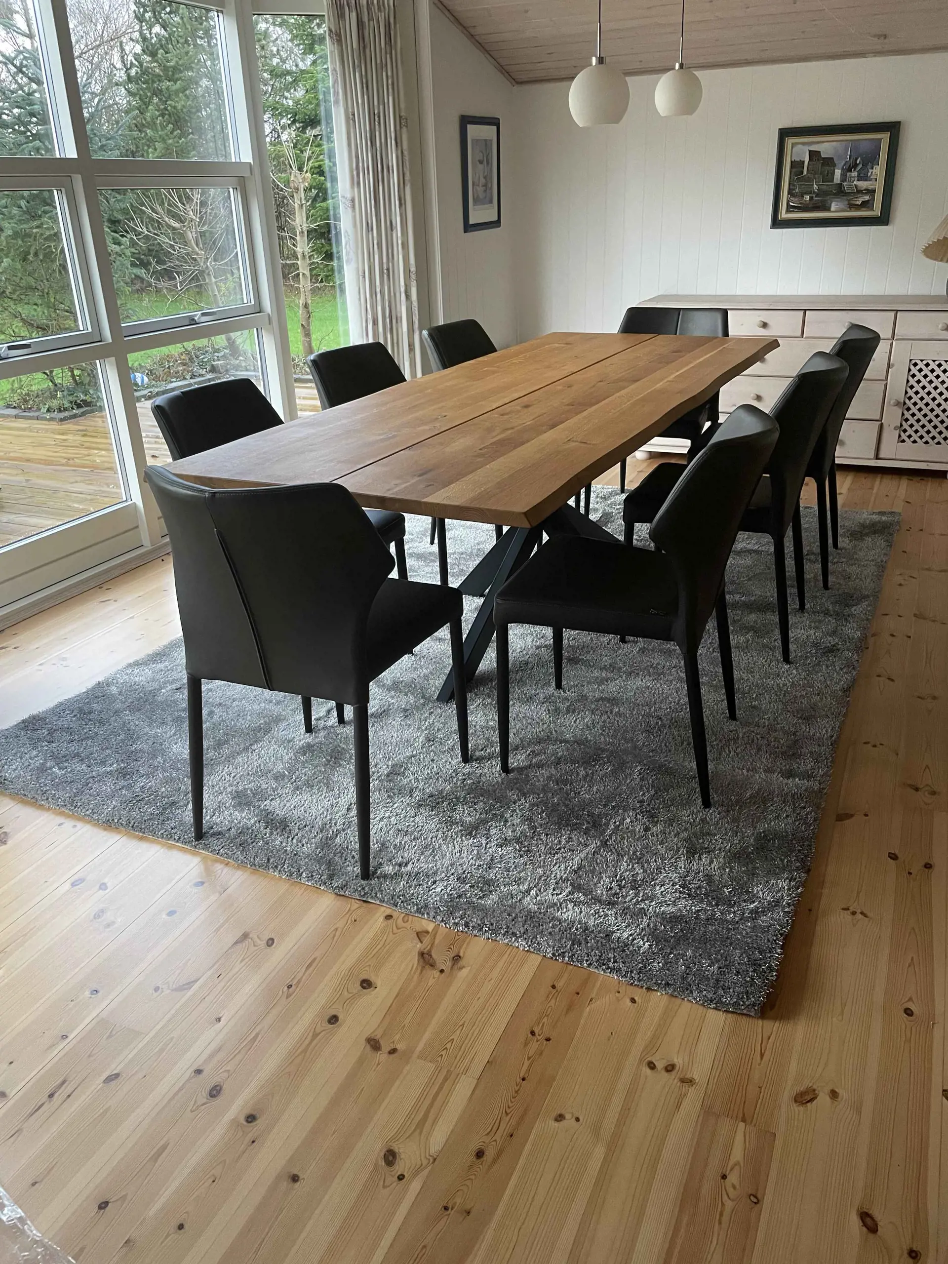 Im Inneren erwartet Sie ein heller und offener Wohnraum mit hohem Dach. Er schließt direkt an den Essbereich an und bildet damit einen natürlichen Treffpunkt für Mahlzeiten und ruhige Abende. Der Grundriss ist funktional und lädt zum Beisammensein ein.