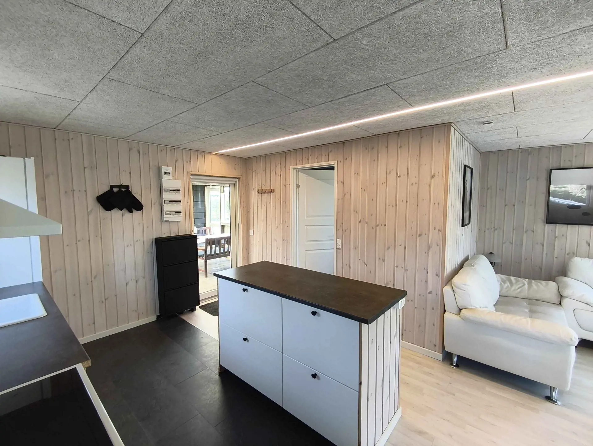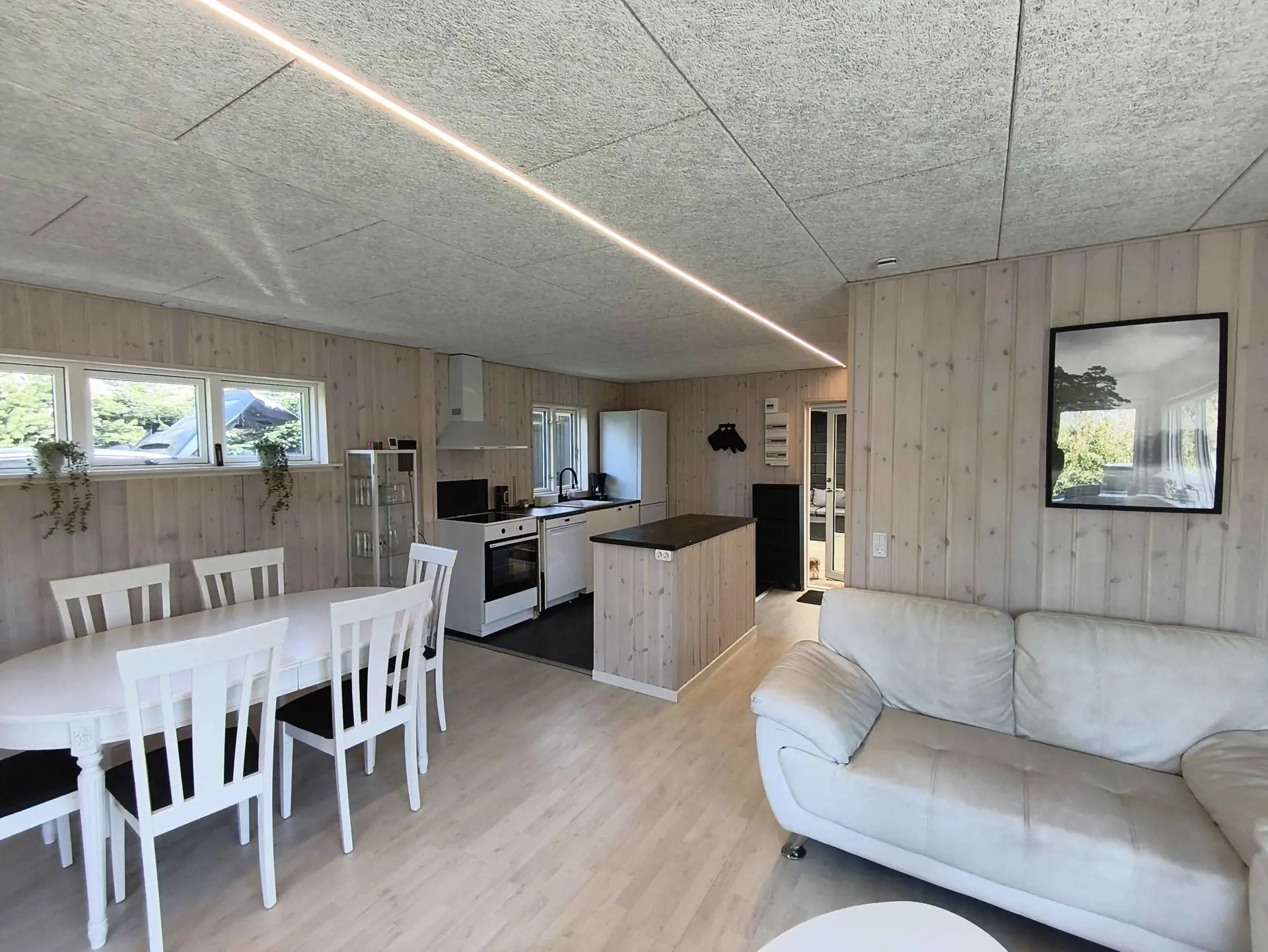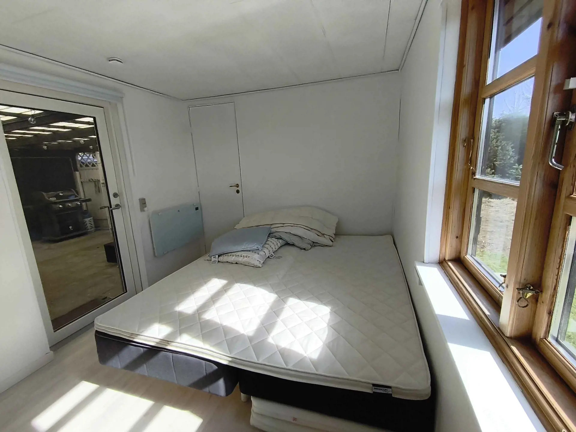 Das Haus verfügt über zwei Schlafzimmer und vier Schlafplätze, verteilt auf Haupthaus und Annex. Die Einrichtung ist schlicht und funktional mit Fokus auf gemeinsames Erleben. Die Raumaufteilung eignet sich sowohl für Familien als auch für zwei Paare.