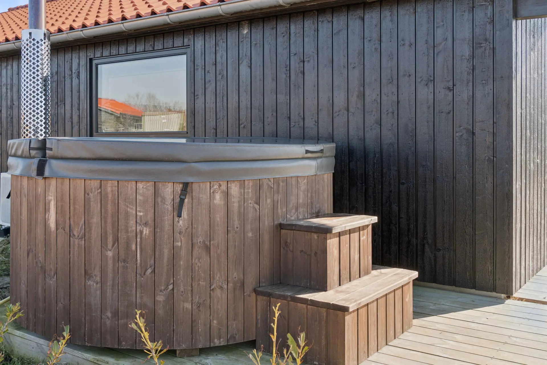 Im Außenbereich befindet sich ein luxuriöser Badezuber mit 1.400 Litern Fassungsvermögen. Bis zu sechs Personen können hier im Sommer wie im Winter unter freiem Himmel entspannen. Das Umfeld ist ruhig und übersichtlich – perfekt für Erholung und Spiel.