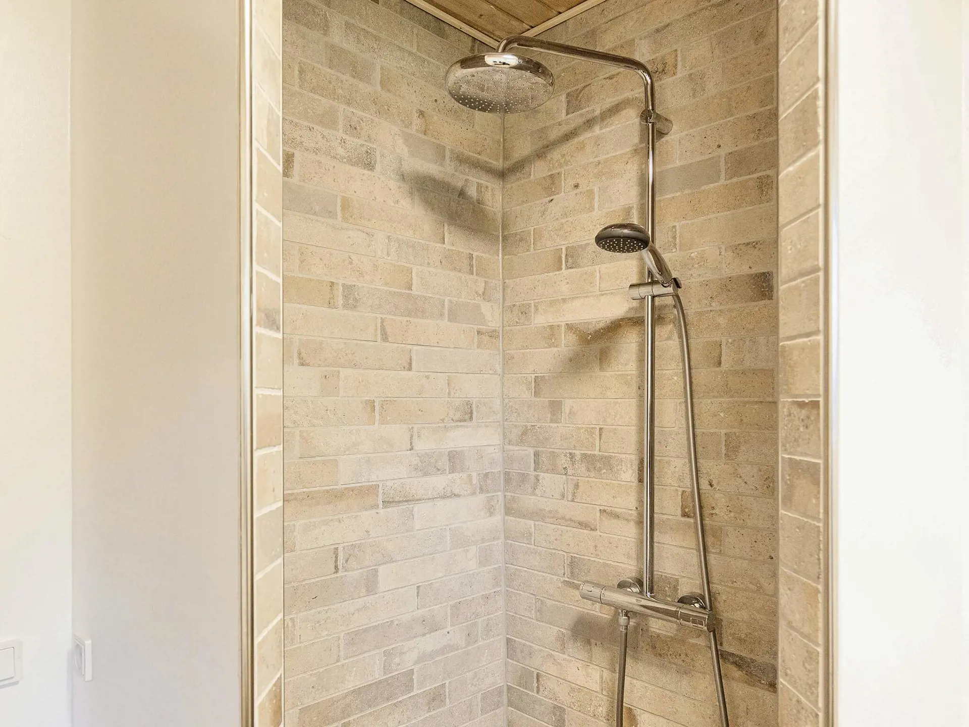 Am Eingang finden Sie einen praktischen Waschtrockner. Das Badezimmer ist neu und geschmackvoll, ausgestattet mit einer stilvollen Schrankanordnung und einer modernen Dusche, die eine entspannte Atmosphäre schafft.