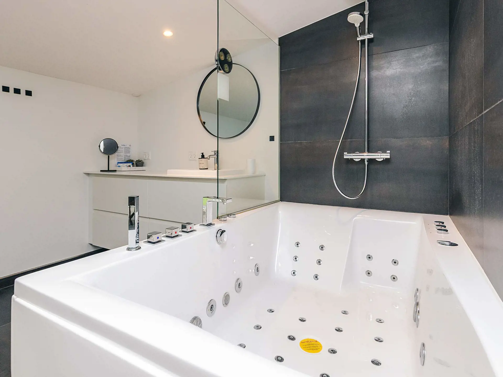 Das geräumige Ferienhaus mit Whirlpool im Innenbereich lädt zu vielen schönen und gemütlichen Momenten ein. Das Haus verfügt über zwei Schlafzimmer mit Doppelbetten (eines davon kann in zwei Einzelbetten geteilt werden) und ein Schlafzimmer mit zwei Einzelbetten. Im Wohnzimmer befindet sich ein Einzelbett auf einem Tagesbett. Das große Badezimmer bietet neben einer Toilette und einer Dusche mit Regendusche auch eine Whirlpool-Badewanne für 2 Personen. Im Haus befindet sich ein weiteres Badezimmer mit Toilette und Dusche mit Regendusche.