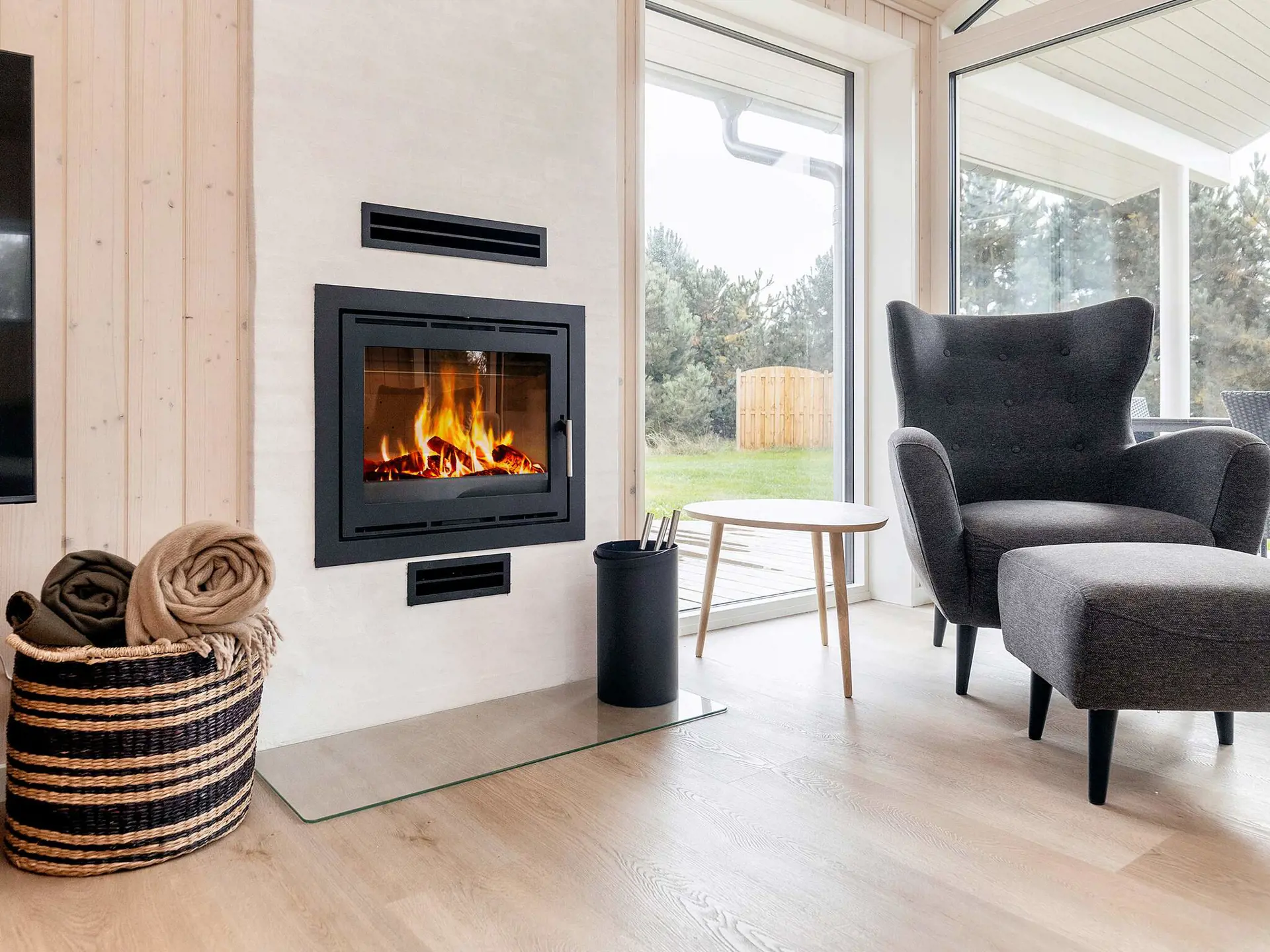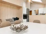 Das gemütliche Wohnzimmer ist offen mit einer modernen Einbauküche kombiniert, in der u.a. Induktionskochfelder, Kaffeemaschine, separater Backofen, Mikrowelle, Kühlschrank, Gefrierschrank 60 Liter und Geschirrspüler bereitstehen. Im Wohnzimmer gibt es Smart-TV und WLAN, außerdem einen Holzofen und eine Nische in der Nähe des Esstischs und der Küche, sodass die kleinen Gäste des Hauses nah beieinander sind.
