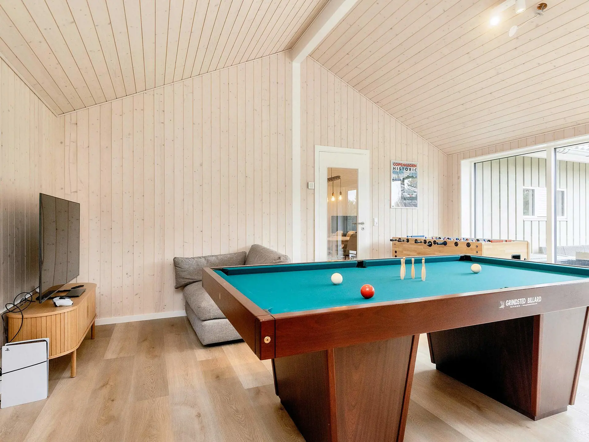 Ansprechendes, modernes Ferienhaus von 2024. auf einem 133 m2 großen Grundstück mit Whirlpool und Sauna im Außenbereich gelegen. Zudem familienfreundlicher Aktivitätsraum im Haus mit Tischfußball, Billard und Smart-TV mit Playstation 5. Über dem Aktivitätsraum findet man den Hems mit Sitzsäcken, ein gemütlicher Bereich für Kinder und Teenager. Das Ferienhaus liegt bei Marielyst, nur etwa 1,5 km von einem der besten und kinderfreundlichsten Strände Dänemarks.
