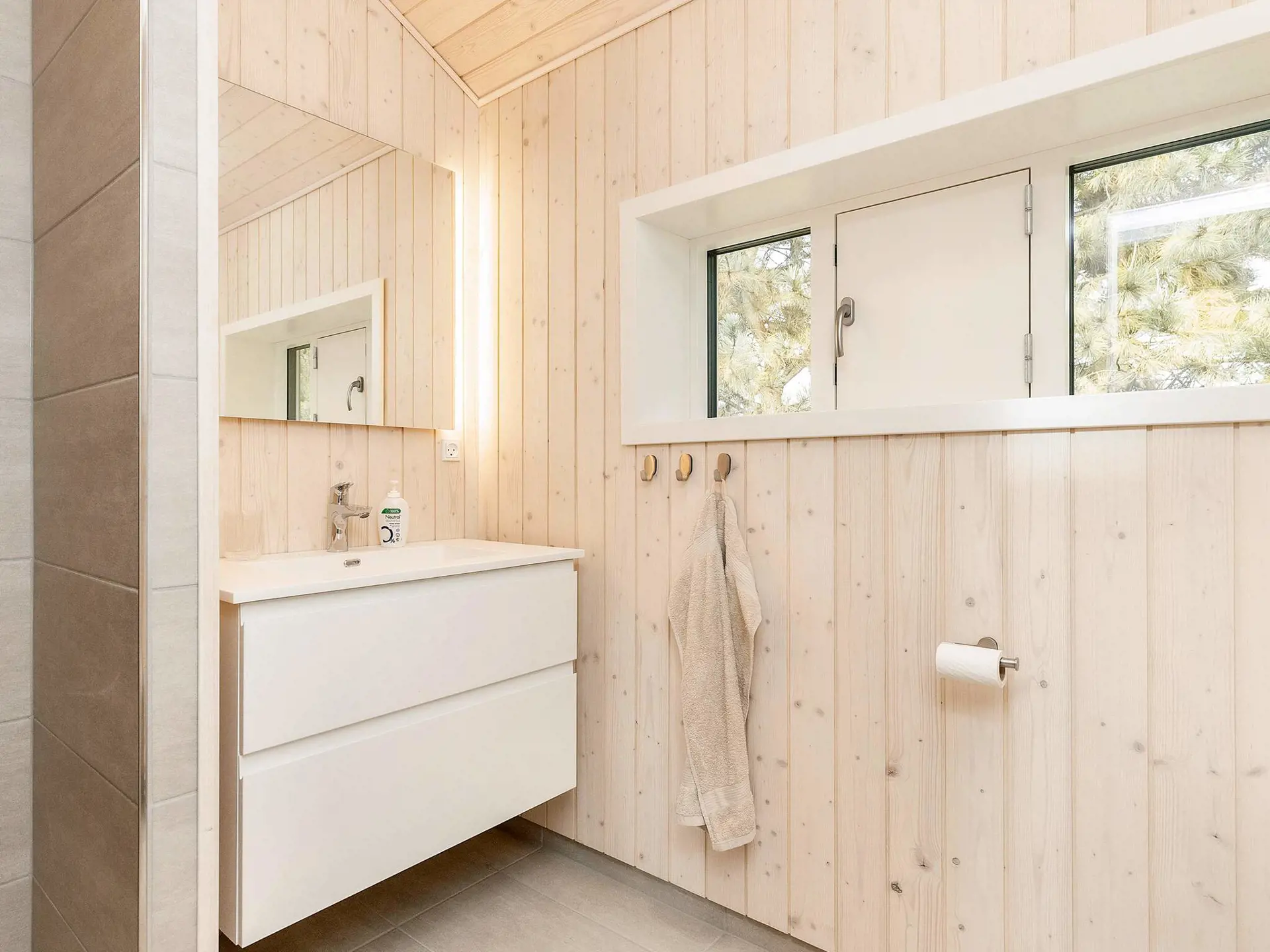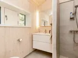 Das Ferienhaus wird mit einer klimafreundlichen Wärmepumpe beheizt. Es gibt vier Schlafzimmer mit jeweils einem Doppelbett, dazu zwei Badezimmer im Haus, jeweils ausgestattet mit Toilette, Waschbecken und Dusche.