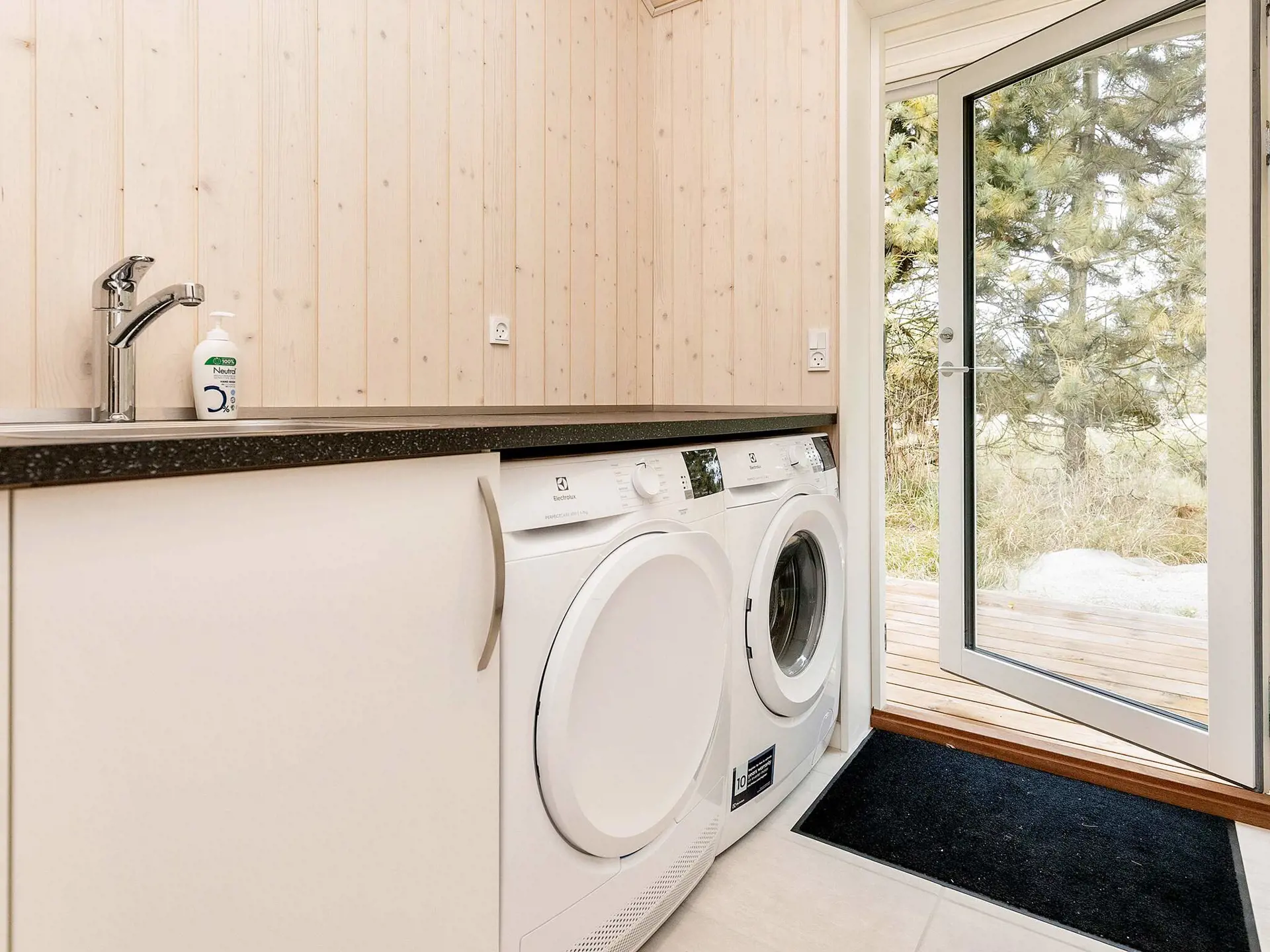 Vom Wohnzimmer aus gelangen Sie direkt hinaus auf die Terrasse, wo Sie in den Gartenmöbeln oder auf den Sonnenliegen die freie Zeit genießen können. Wenn der Abend naht können Sie diesen auf der überdachten Terrasse verlängern und ein leckeres Essen zaubern auf dem großen Gasgrill.