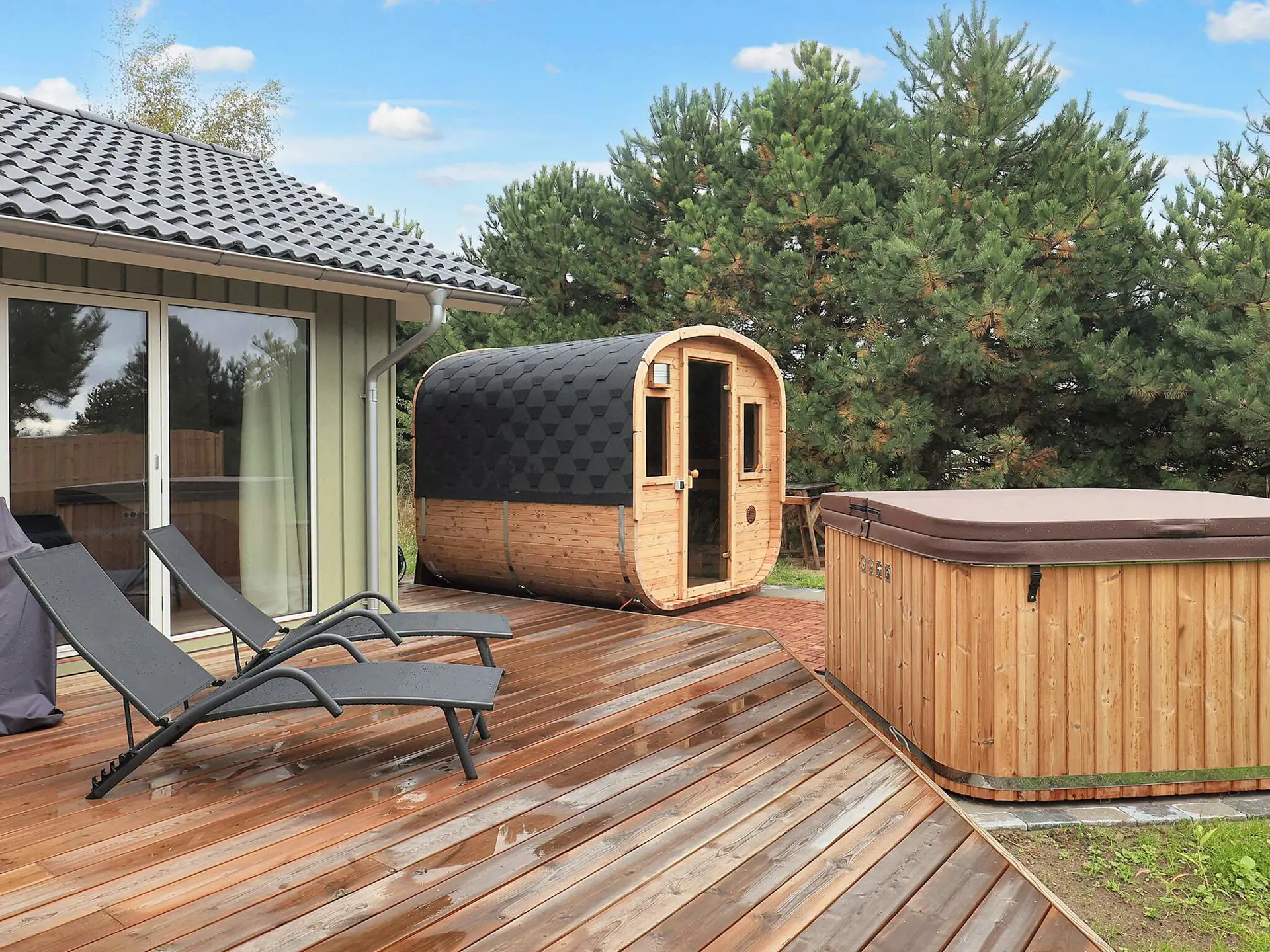 Das Grundstück ist 1.500 m2 groß, es gibt also viel Platz zum Spielen dazu 2 Fußballtore sowie einen Sandkasten und viele Spiele im Freien. Nicht zu vergessen ist der große Whirlpool im Freien für max. 6 Personen, in dem Sie das ganze Jahr über baden können. Es besteht die Möglichkeit, direkt vom Außenwhirlpool in die heiße Sauna zu gelangen oder die Außendusche zu nutzen.