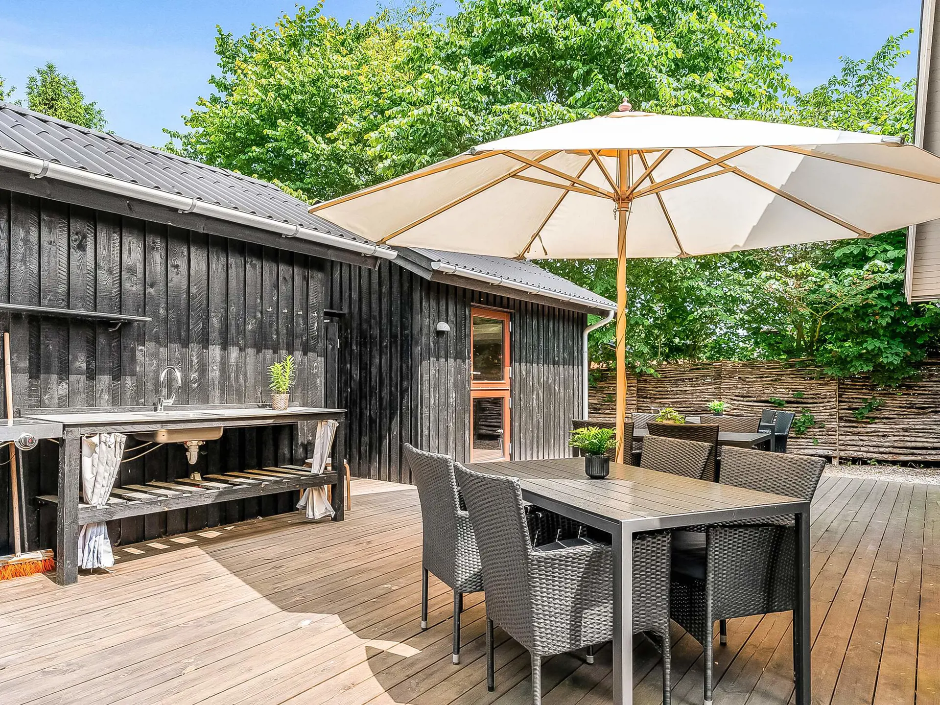 Genießen Sie die Sonne auf der Terrasse in den Gartenmöbeln oder auf den Sonnenliegen. Und wenn es Abend wird, können Sie die Gemütlichkeit unter der teilweise überdachten Terrasse ausdehnen und ein köstliches Essen auf dem Gasgrill zaubern. Von einem kleinen Waldweg hinter dem Haus gelangen Sie direkt zum Strand.