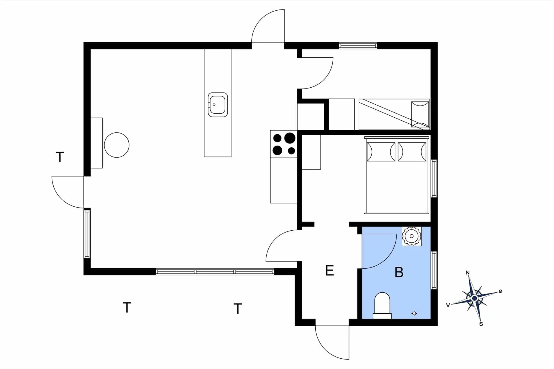 Das Ferienhaus verfügt über: Eingangsbereich, Badezimmer mit WC und Dusche, zwei gemütliche Schlafzimmer mit einem Doppelbett in einem und einem Etagenbett im anderen Schlafzimmer. Darüber hinaus gibt es eine offene Küche mit Essbereich und Sofaecke. Das Wohnzimmer verfügt über einen Holzofen und Zugang zur schönen Terrasse des Ferienhauses.