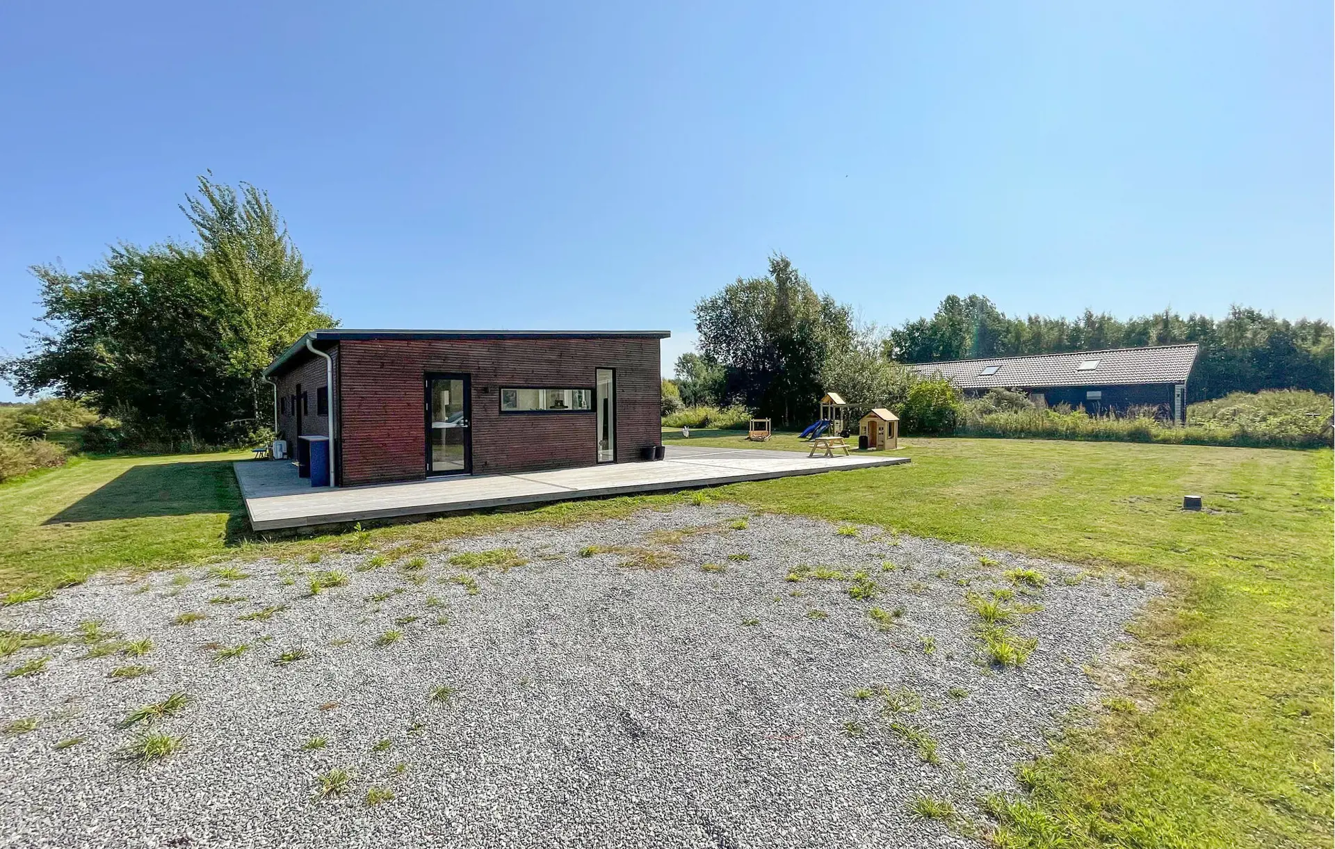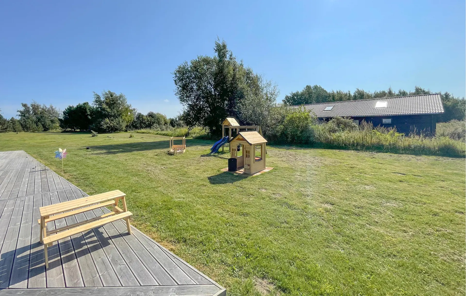 An warmen Tagen bietet die großzügige Terrasse ideale Möglichkeiten, die Sonne zu genießen und gemeinsame Stunden im Freien zu verbringen. Bereiten Sie leckere Mahlzeiten auf dem Grill zu, während die Kinder sich ausgelassen auf dem Spielturm vergnügen.