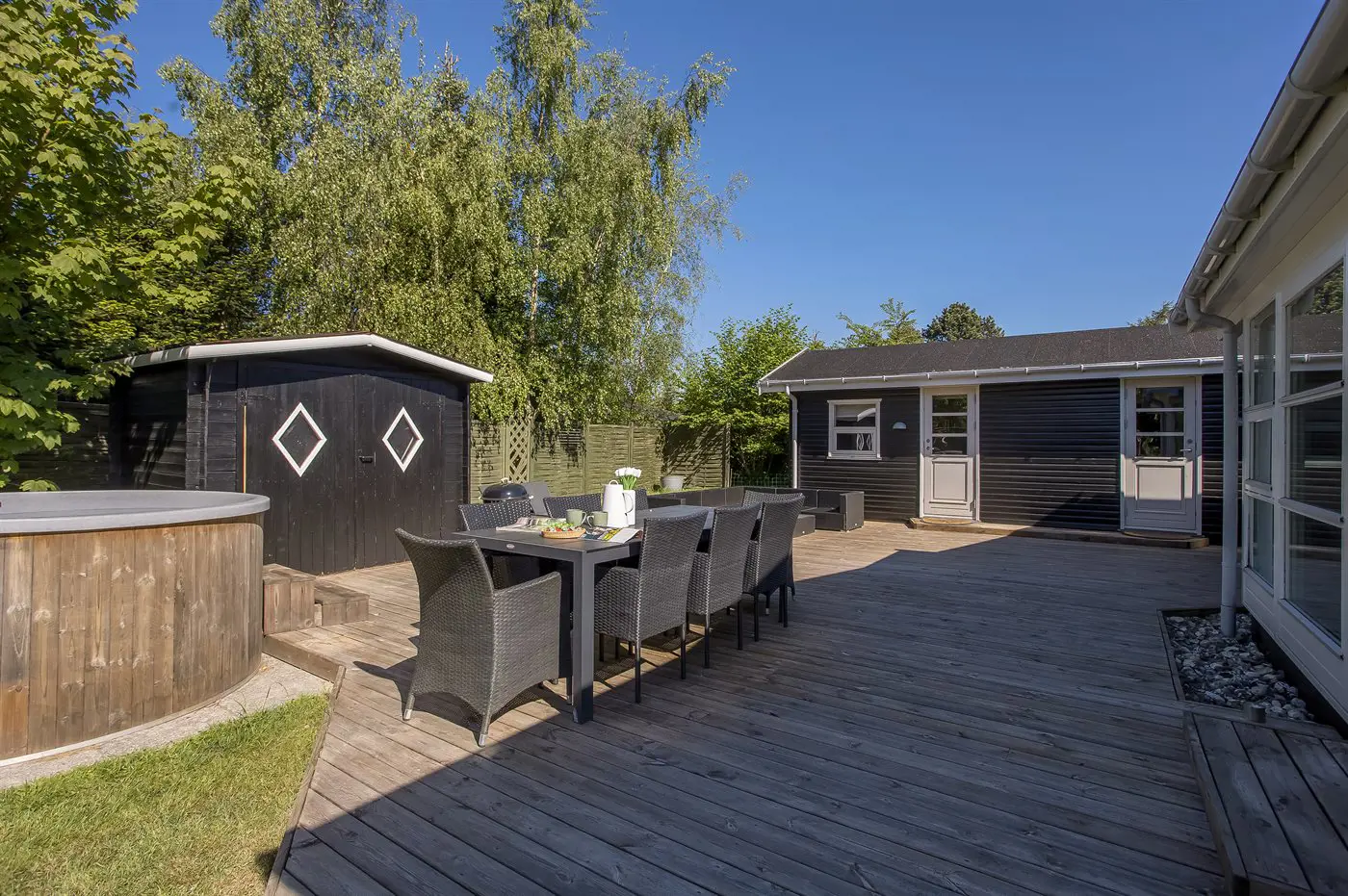 Es gibt eine gute Terrasse mit einem schönen Hot-Tub für 6 Personen, viel Platz für schöne Stunden im Freien sowie einen Grill, auf dem du an einem warmen Sommertag etwas Leckeres zubereiten kannst. Außerdem gibt es vom Wohnzimmer aus Zugang zu einem geräumigen Wintergarten.