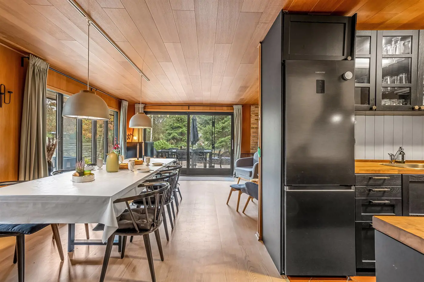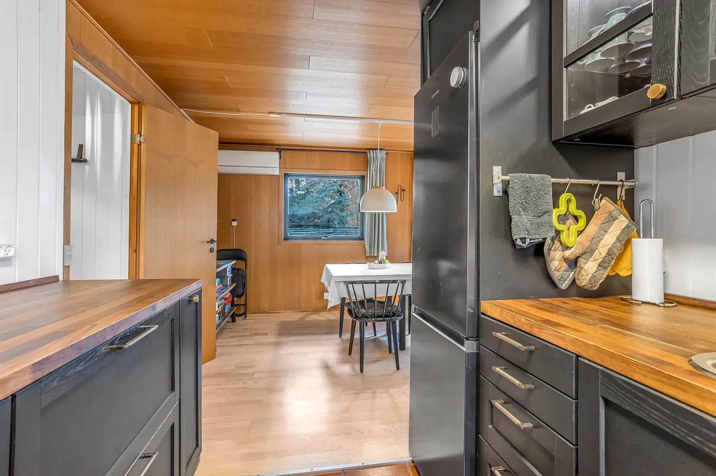 Die Küche ist mit Kühlschrank ausgestattet. Außerdem gibt es 4 Induktions-Kochzonen, Umluftofen, Mikrowelle sowie Geschirrspüler.