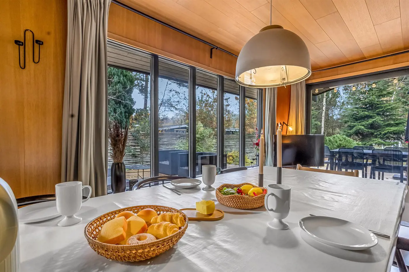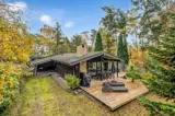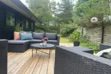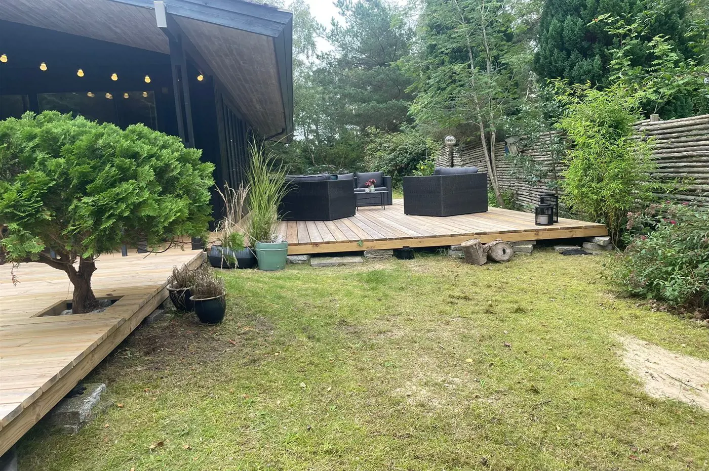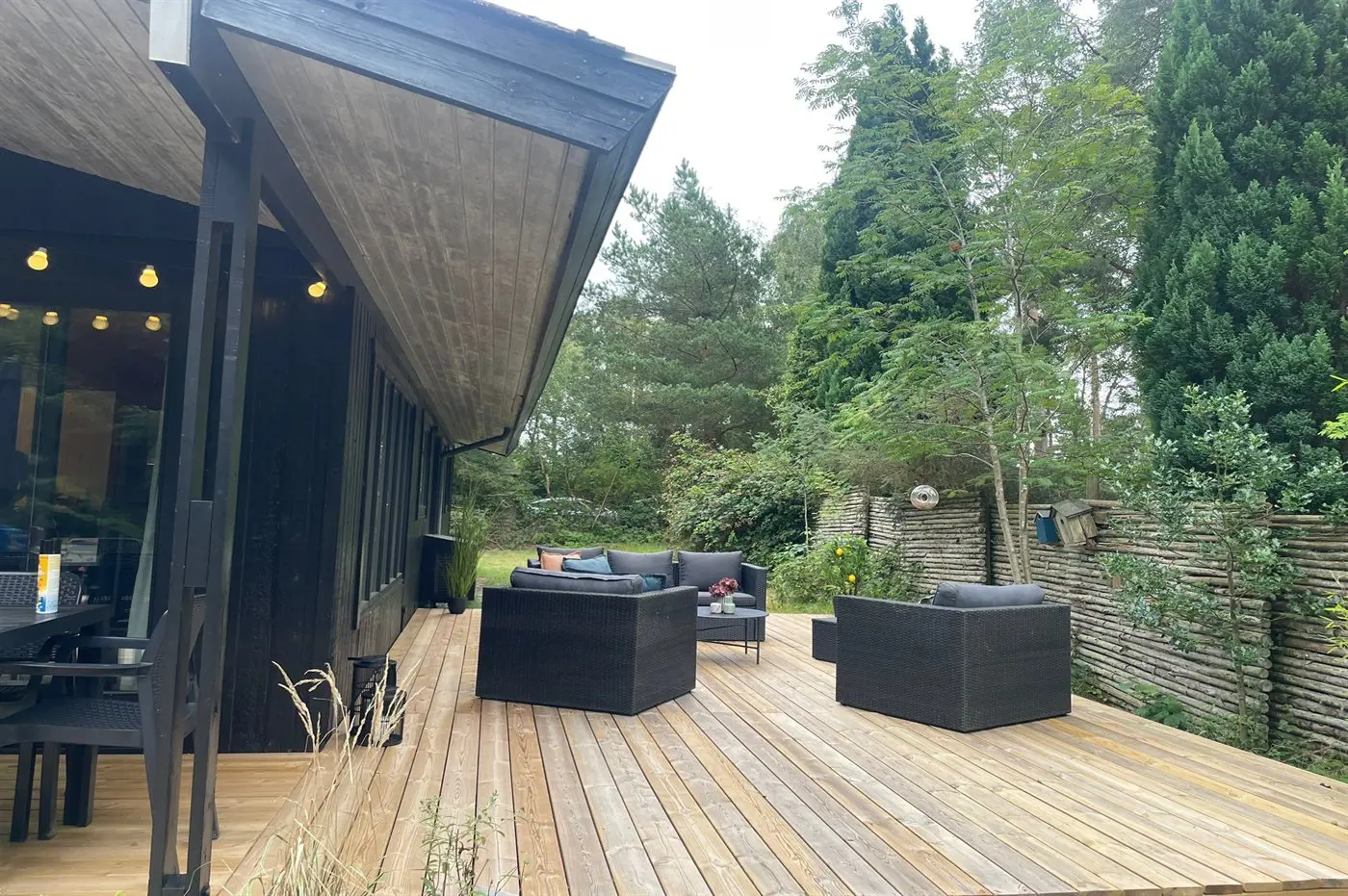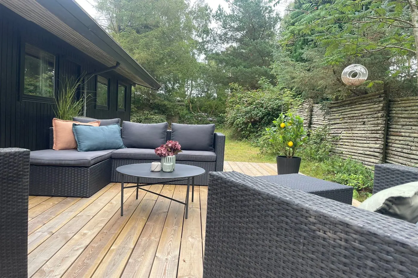 Zum Haus gehört eine schöne Holzterrasse mit viel Platz, um die Stunden im Freien zu genießen – mit Loungemöbeln und Grill.