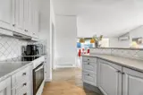 Die Küche ist mit Kühlschrank ausgestattet. Außerdem gibt es 4 Keramik-Kochfelder, Umluftofen, Airfryer sowie Geschirrspüler.