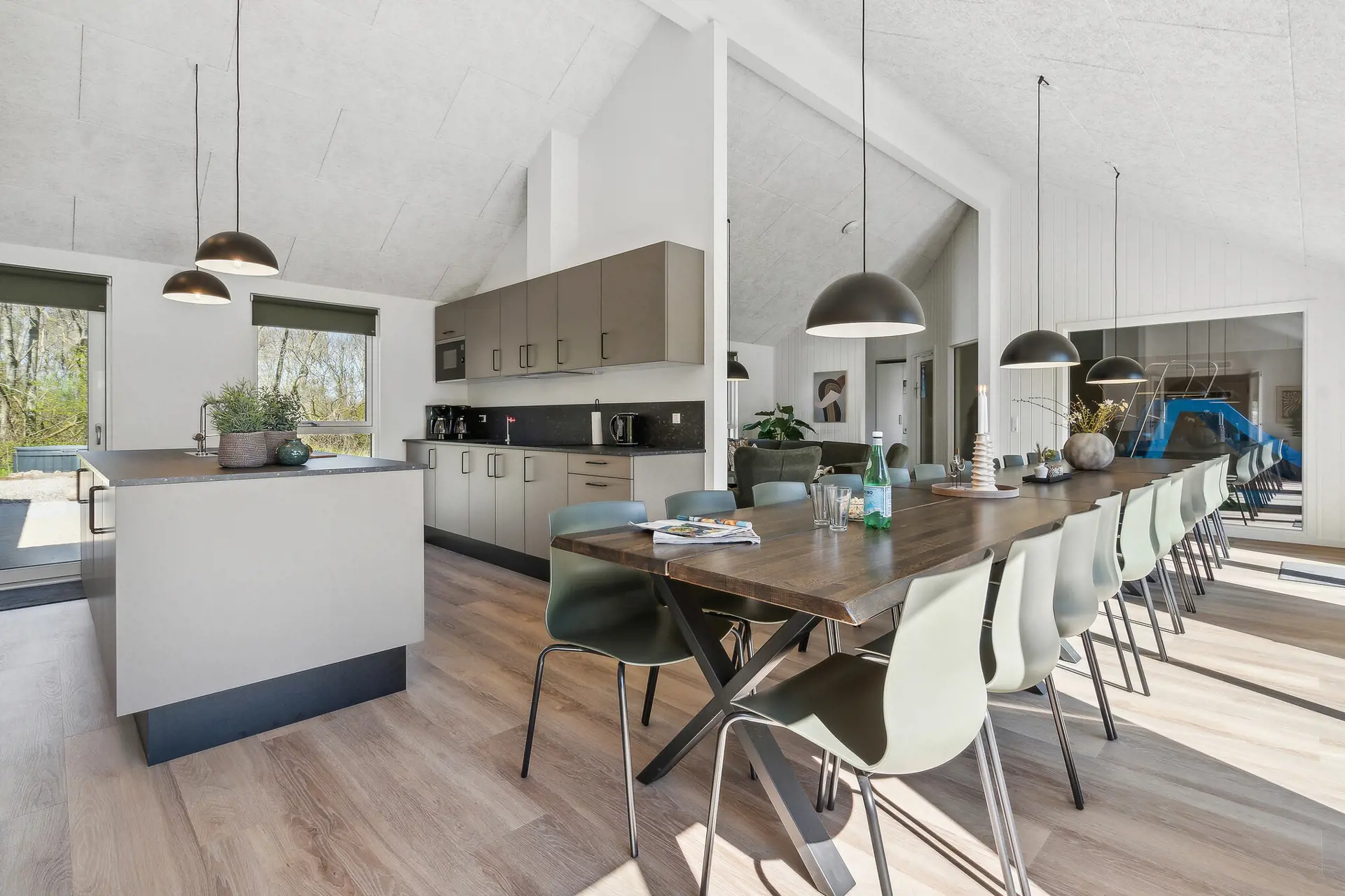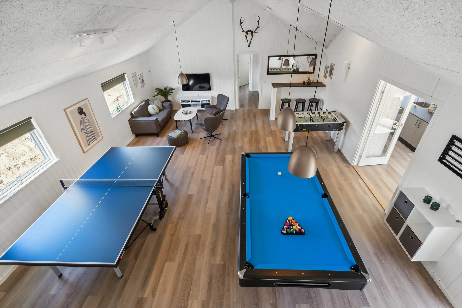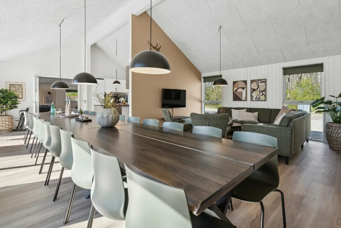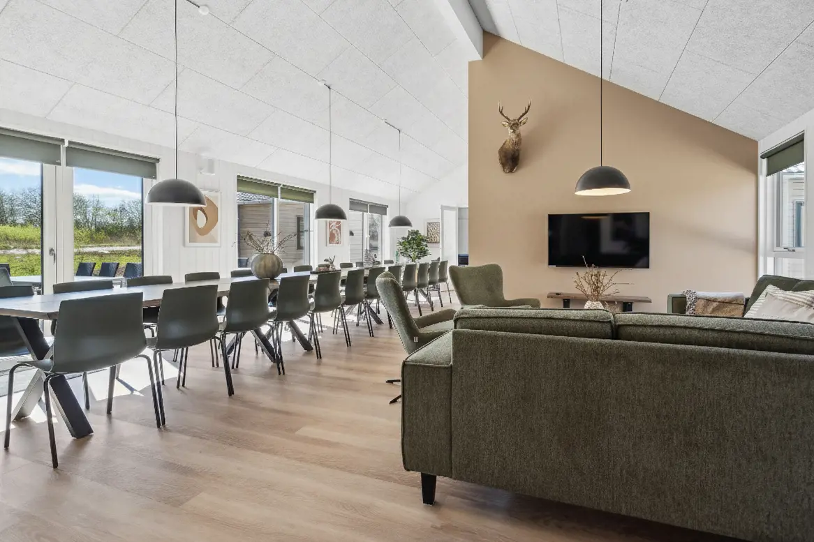 Dieses große Ferienhaus in Marielyst bietet mit 9 Schlafzimmern, Familienzimmer und zwei Schlafböden reichlich Platz – ideal für Gruppen. Vier Bäder, ein heller Wohnraum mit XL-Küche, langem Esstisch, Weinkühler und Projektor machen das Haus perfekt für Familien oder Firmenaufenthalte. Im Aktivitätsraum warten Billard, Tischtennis, Tischfußball und Darts, dazu Bar und Sofaecke. Der Pool mit Rutsche, die Außensauna und der Whirlpool sorgen für Spaß und Entspannung. Auf der Terrasse mit Grill und Gartenmöbeln lässt sich der Urlaub genießen, während die Kinder spielen. Mit Multisportfeld, Spielplatz und Strandnähe ist dies das ideale Haus für Komfort und Gemeinschaft.