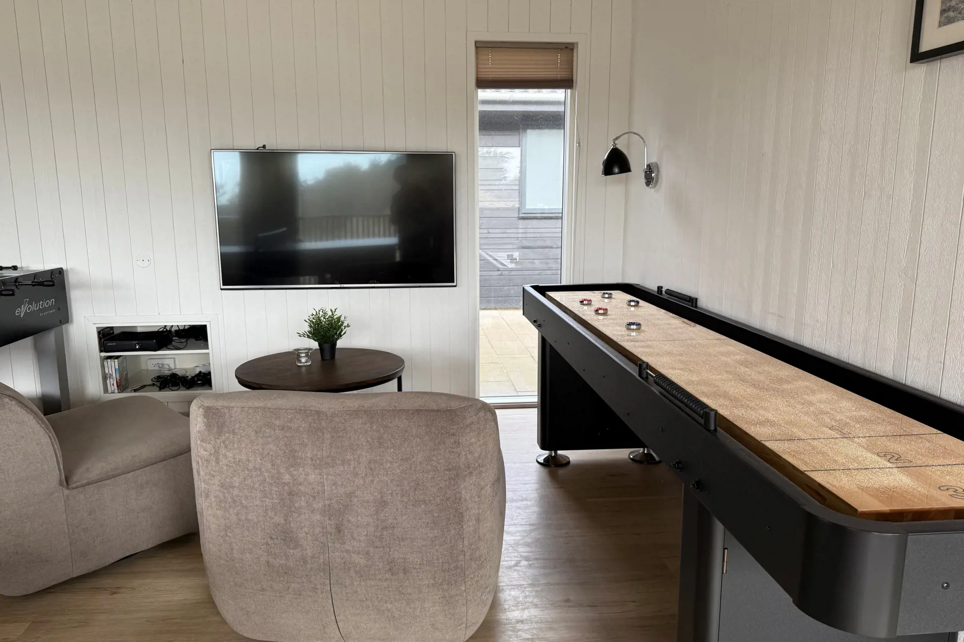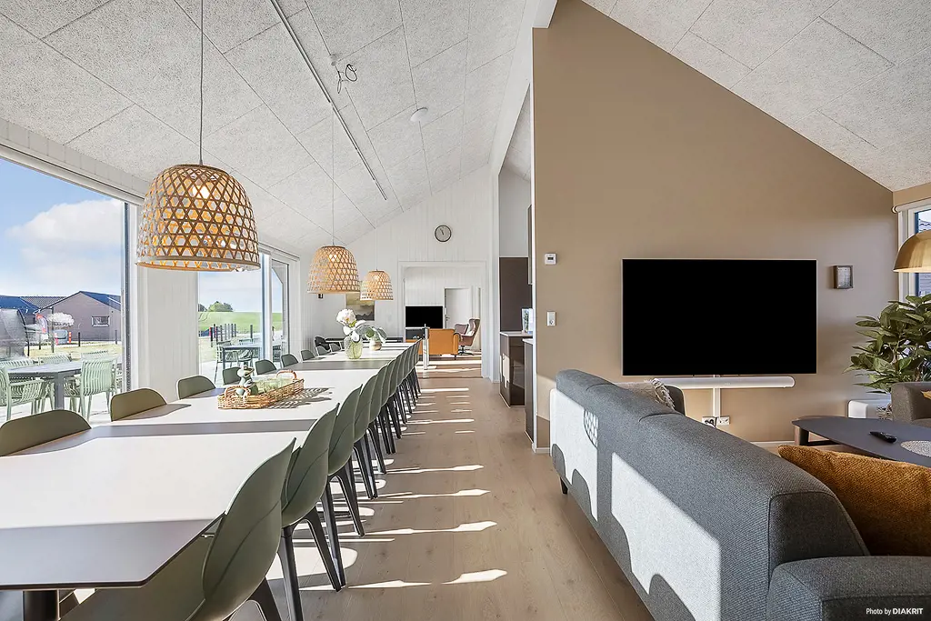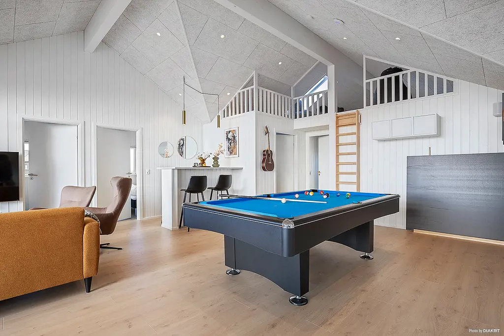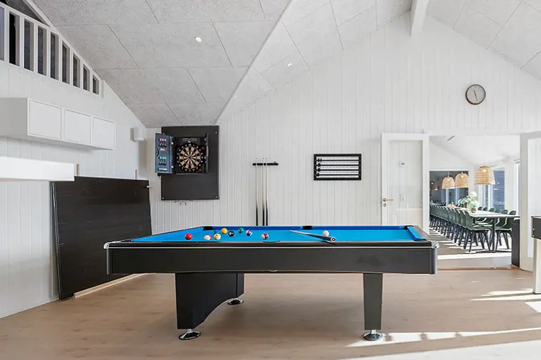 Dieses große Poolferienhaus in Marielyst ist ideal für Urlaub, Firmenveranstaltungen oder Familientreffen mit bis zu 26 Personen. Das Haus ist als einladendes Sammenhus™ gestaltet und bietet einen großzügigen Wohnbereich mit XL-Küche und langem Esstisch, an dem alle zusammenkommen können. Beamer und Leinwand machen den Raum perfekt für Filmabende, Sportübertragungen oder Präsentationen. Im Aktivitätsraum sorgen Billard, Tischtennis, Shuffleboard, Dart und PlayStation für Unterhaltung, während der Poolbereich mit Wasserrutsche Badespaß für Groß und Klein bietet. Draußen erwarten Sie eine große Terrasse mit Grill und Terrassenheizern sowie ein schöner Wellnessbereich mit Außenspa, Sauna und Außendusche. Eine Ladestation für Elektroautos und ein großer gemeinsamer Spielplatz runden das Angebot ab. Zudem liegt das Haus nah an Strand, Restaurants und vielen Freizeitmöglichkeiten in Marielyst.