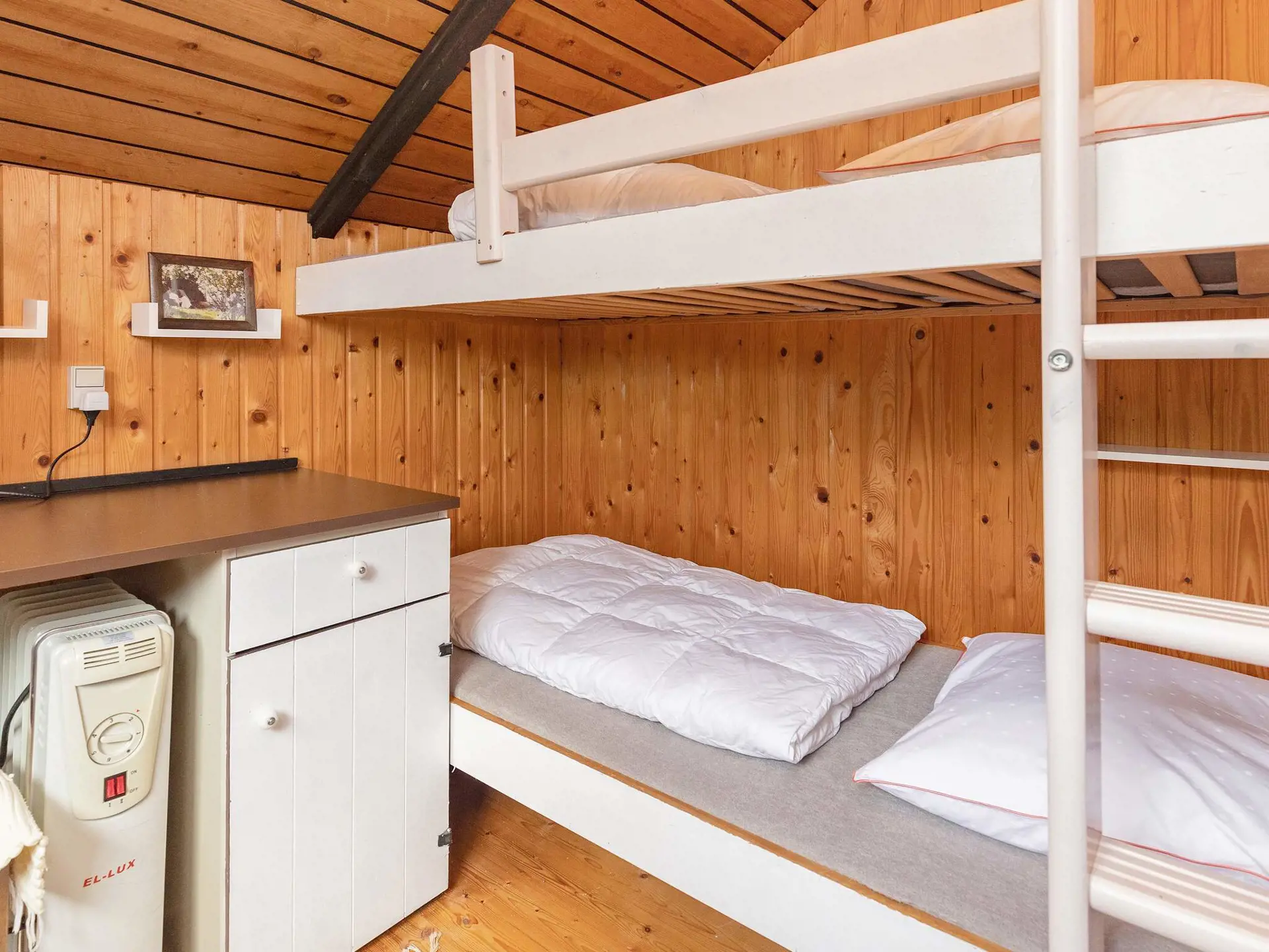 Die Schlafplätze verteilen sich auf ein Zimmer mit Doppelbett und ein zweites Zimmer mit Etagenbett mit zwei Kojen.