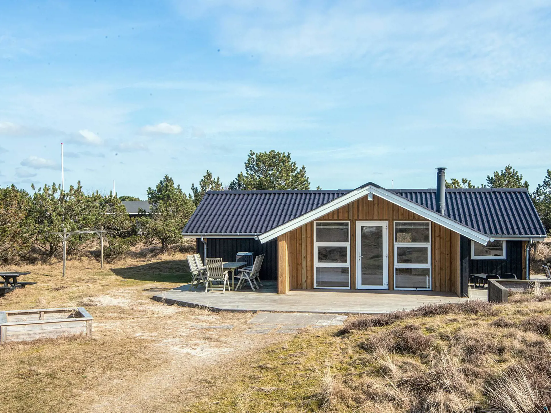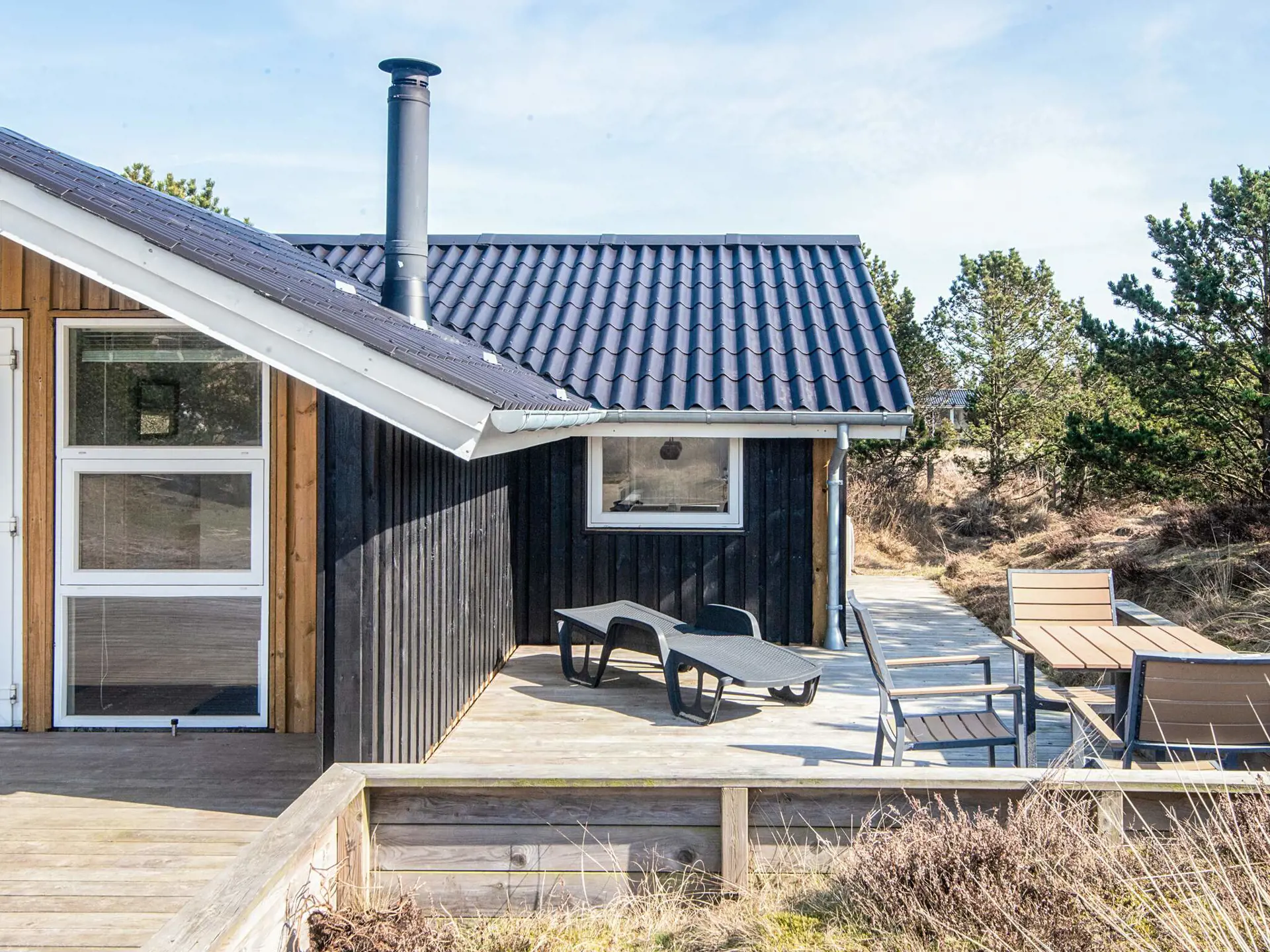 Vom Wohnzimmer aus gelangen Sie direkt auf die große Holzterrasse, die sich ideal für das Leben im Freien eignet. Hier gibt es viel Platz zum Sonnenbaden, für Mahlzeiten unter freiem Himmel und für gemütliche Abende. Das hügelige Grundstück lädt zu Spiel, Aufenthalt und Naturerlebnissen direkt vor der Tür ein.