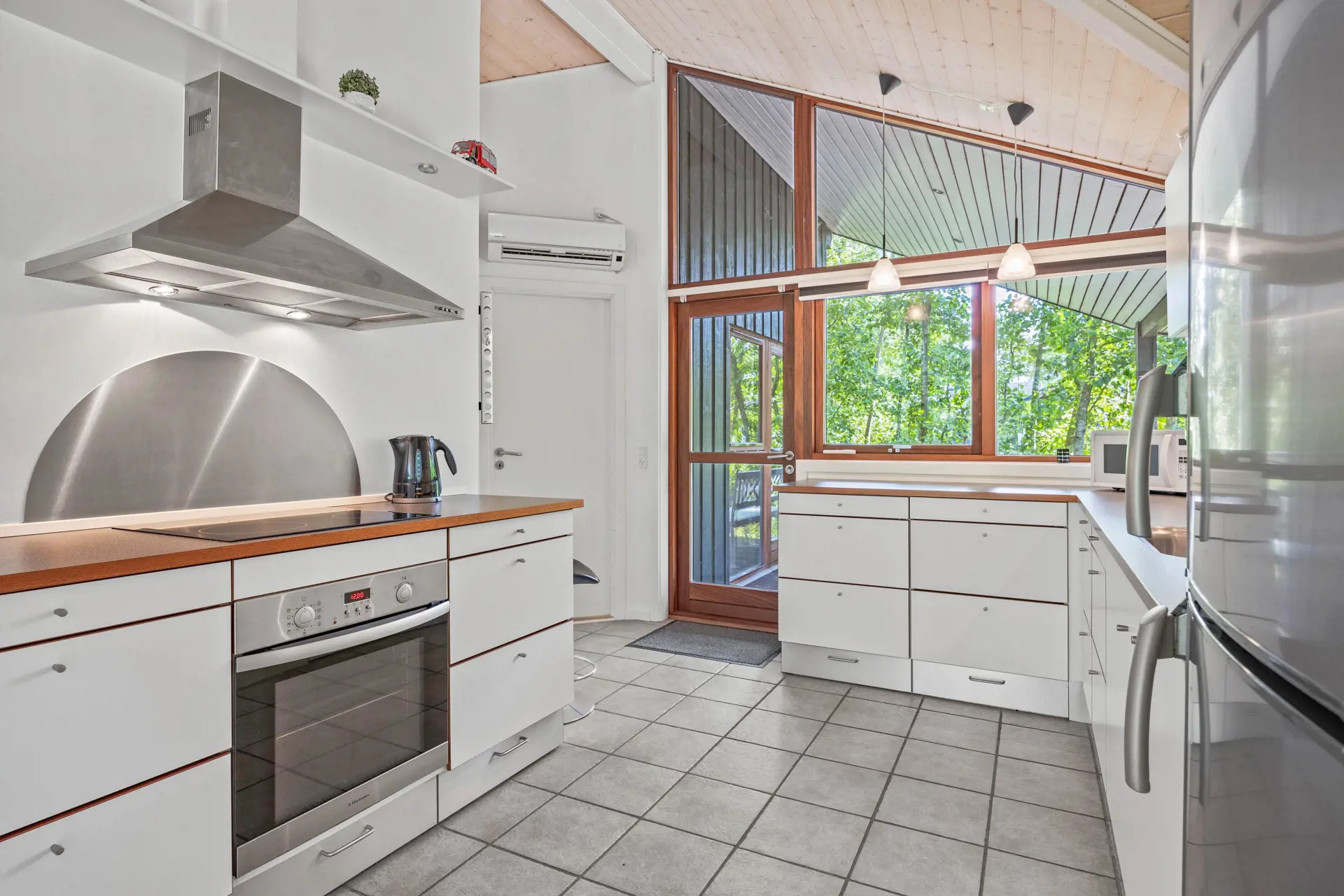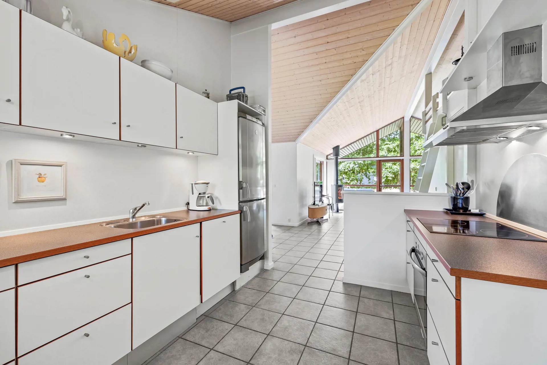 Durch die großen Fenster ist der Wohn-Essbereich mit der offenen Küche hell und freundlich. Die geräumige und gut ausgestattete Küche bietet alles, was gebraucht wird, um ein gutes Abendessen für die Familie zuzubereiten, einschließlich eines Geschirrspülers für den schnellen Abwasch. Durch die offene Gestaltung der Küche, fühlt sich hier keiner allein.