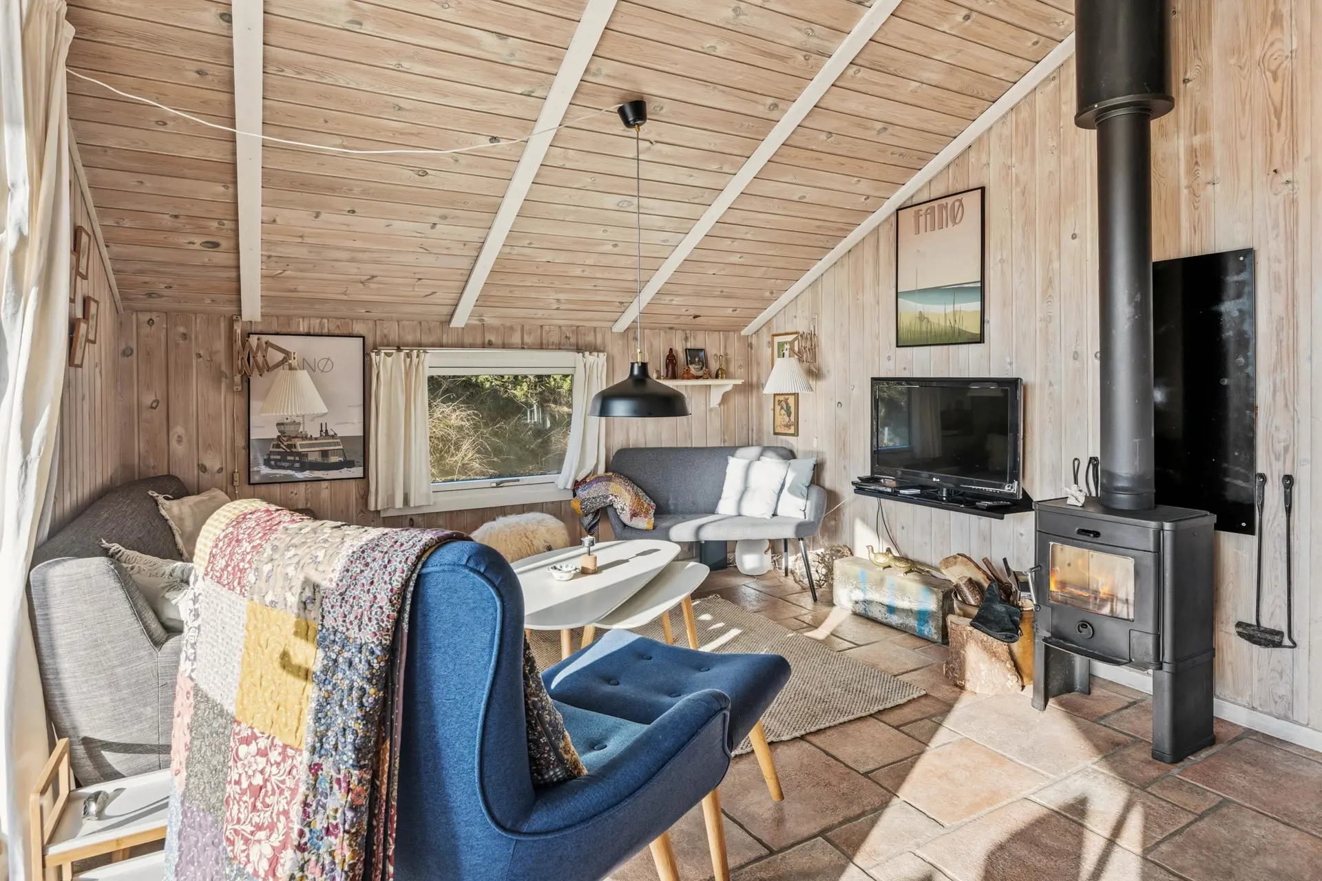 Wenn draußen der Wind über die Insel zieht, wird es im Wohnbereich mit Kaminofen schnell warm und gemütlich. Hier kommt ihr zusammen, spielt Karten, lest ein gutes Buch oder macht es euch einfach mit einer Tasse Tee auf dem Sofa bequem – ganz entspannt und im eigenen Tempo.