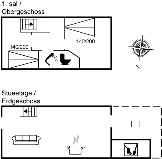 Die Schlafplätze verteilen sich auf 2 Schlafräume. 4 Schlafplätze in Doppelbetten. 1 Schlafplatz auf einer Matratze. 1 von diesen Schlafplätzen befindet sich im offenen Obergeschoss. Ferner steht ein Kinderbett zur Verfügung.