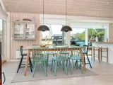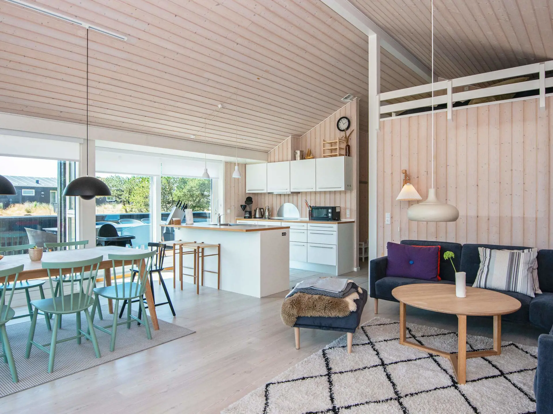 Das Ferienhaus ist zeitgemäß eingerichtet, mit luftiger Raumhöhe im Küchen-/Wohnbereich mit Essekce und Holzofen. Die große Fensterfront mit Schiebetüren bietet Zutritt zur insgesamt 60 m2 großen Terrassenfläche, von der ein Teil überdacht ist.