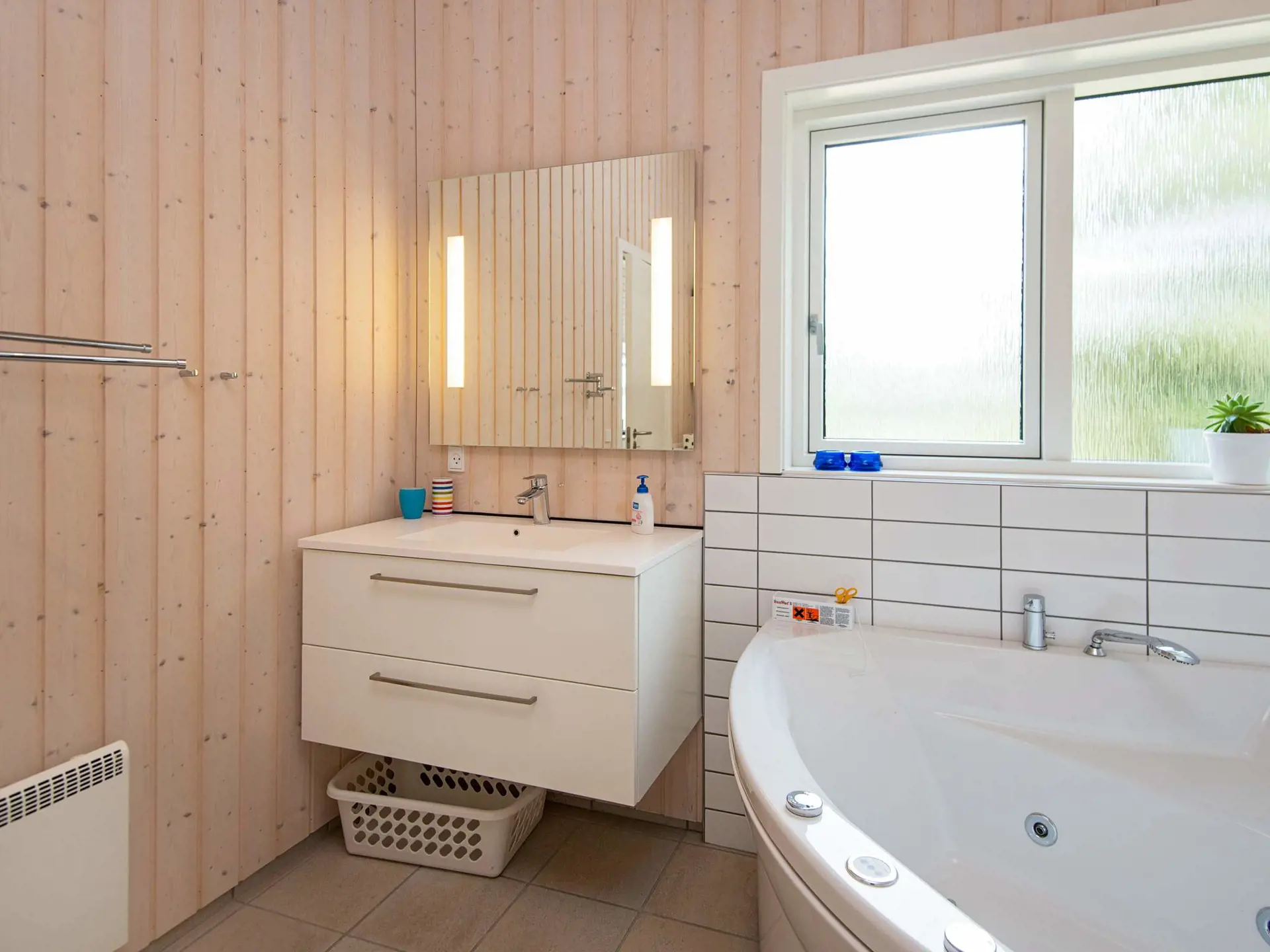 Hell und wohnlich eingerichtetes Ferienhaus mit Whirlpool in einem der beiden Bäder des Hauses. Liegt in Rindby, nur wenige Gehminuten vom Strandufer entfernt.