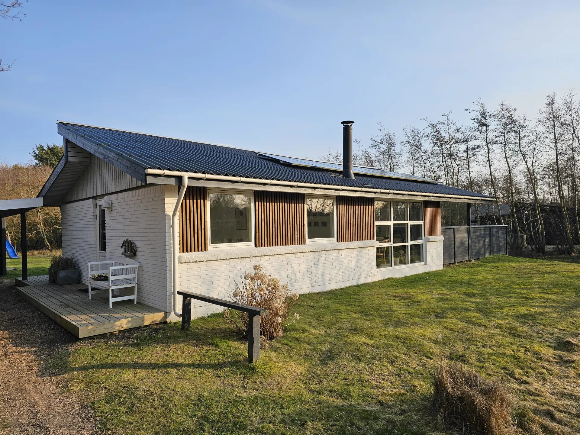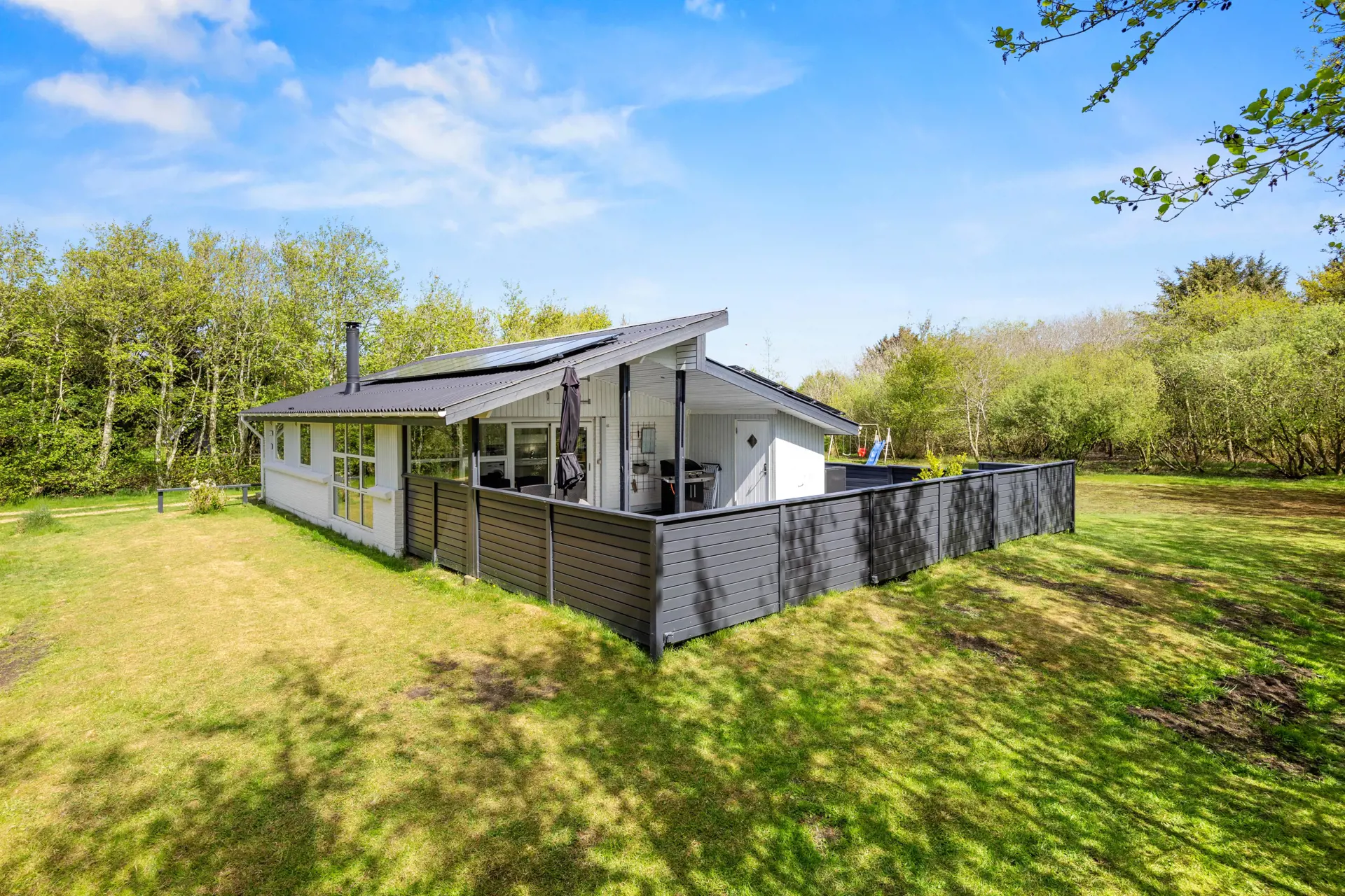 Euer Ferienhaus liegt ganz idyllisch auf einem umwachsenen, 1834 qm großen Rasengrundstück. Auf der großzügigen Terrasse, die teilweise überdacht und komplett umzäunt ist, erwarten euch bequeme Gartenmöbel und Sonnenliegen – perfekt zum Entspannen.