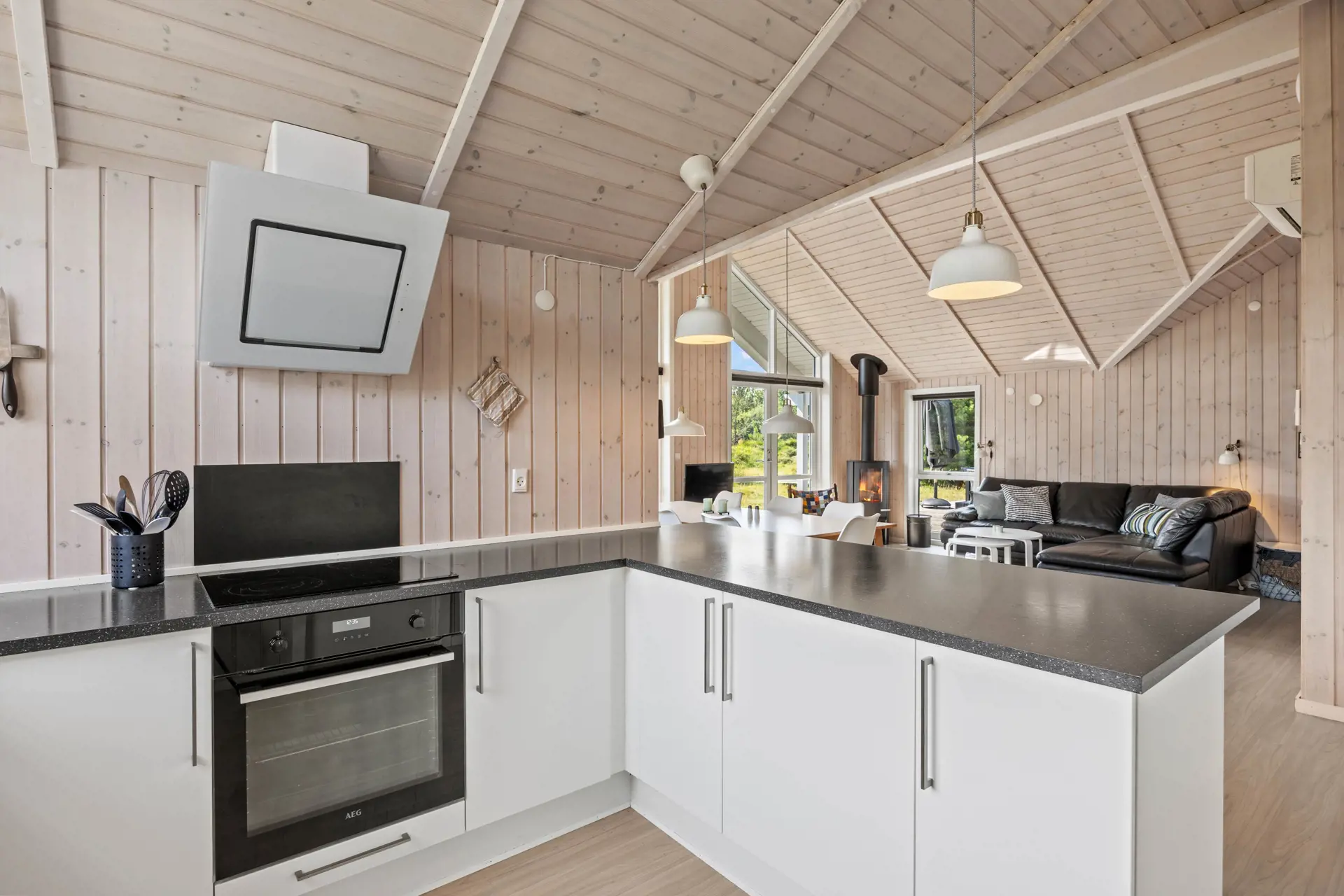 Der offene Wohnbereich bildet das Herzstück eures Ferienhauses. Hier gehen Küche, Ess- und Wohnzimmer fließend ineinander über und schaffen eine helle, einladende Atmosphäre. Während ihr gemeinsam kocht, könnt ihr euch gleichzeitig unterhalten, spielen oder entspannen. Der gemütliche Holzofen sorgt für eine wohlige Wärme an kühleren Tagen, während die moderne Wärmepumpe das ganze Jahr über für ein angenehmes Raumklima sorgt. Durch die offene Gestaltung entsteht ein großzügiges Raumgefühl, das euren Aufenthalt besonders angenehm macht.