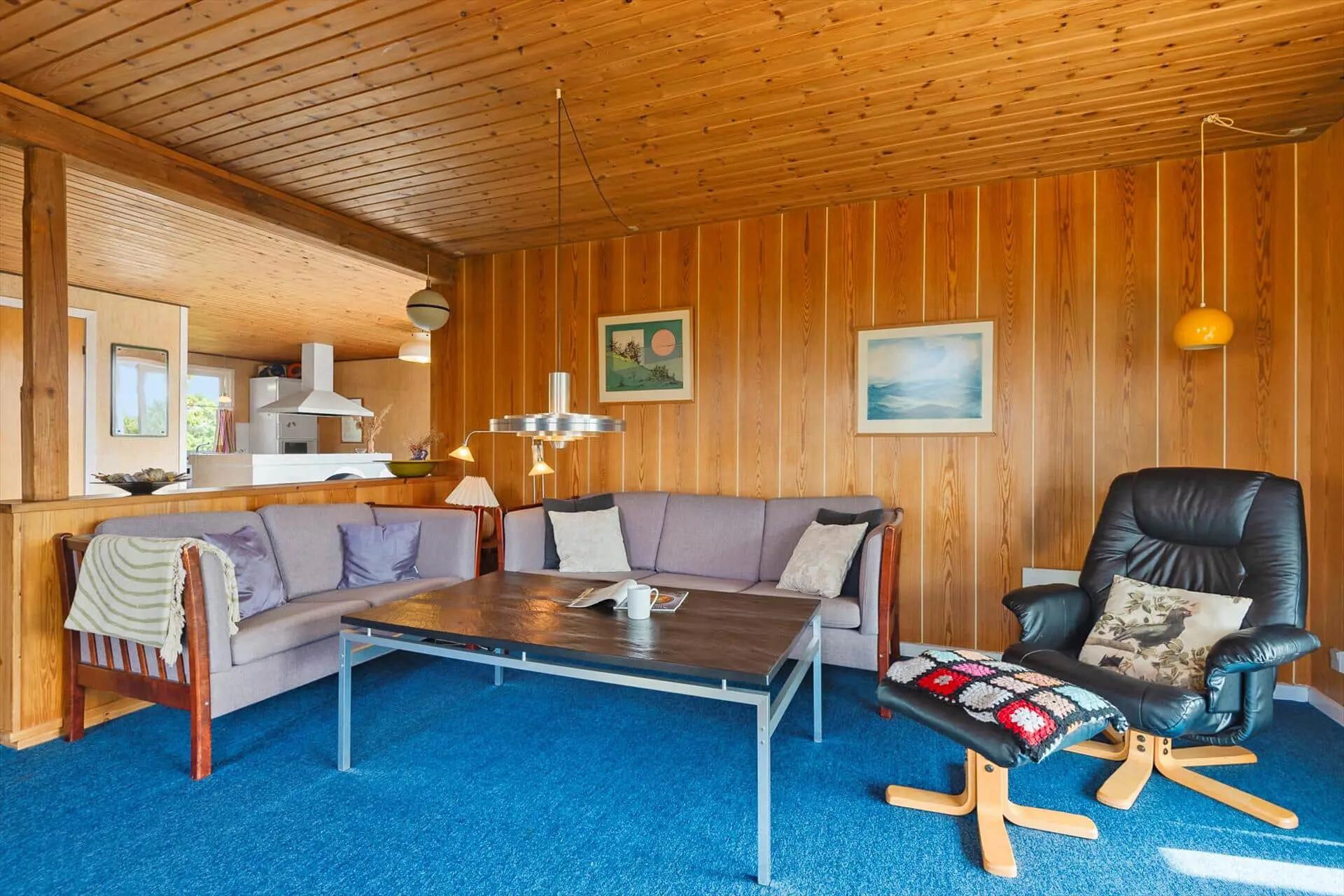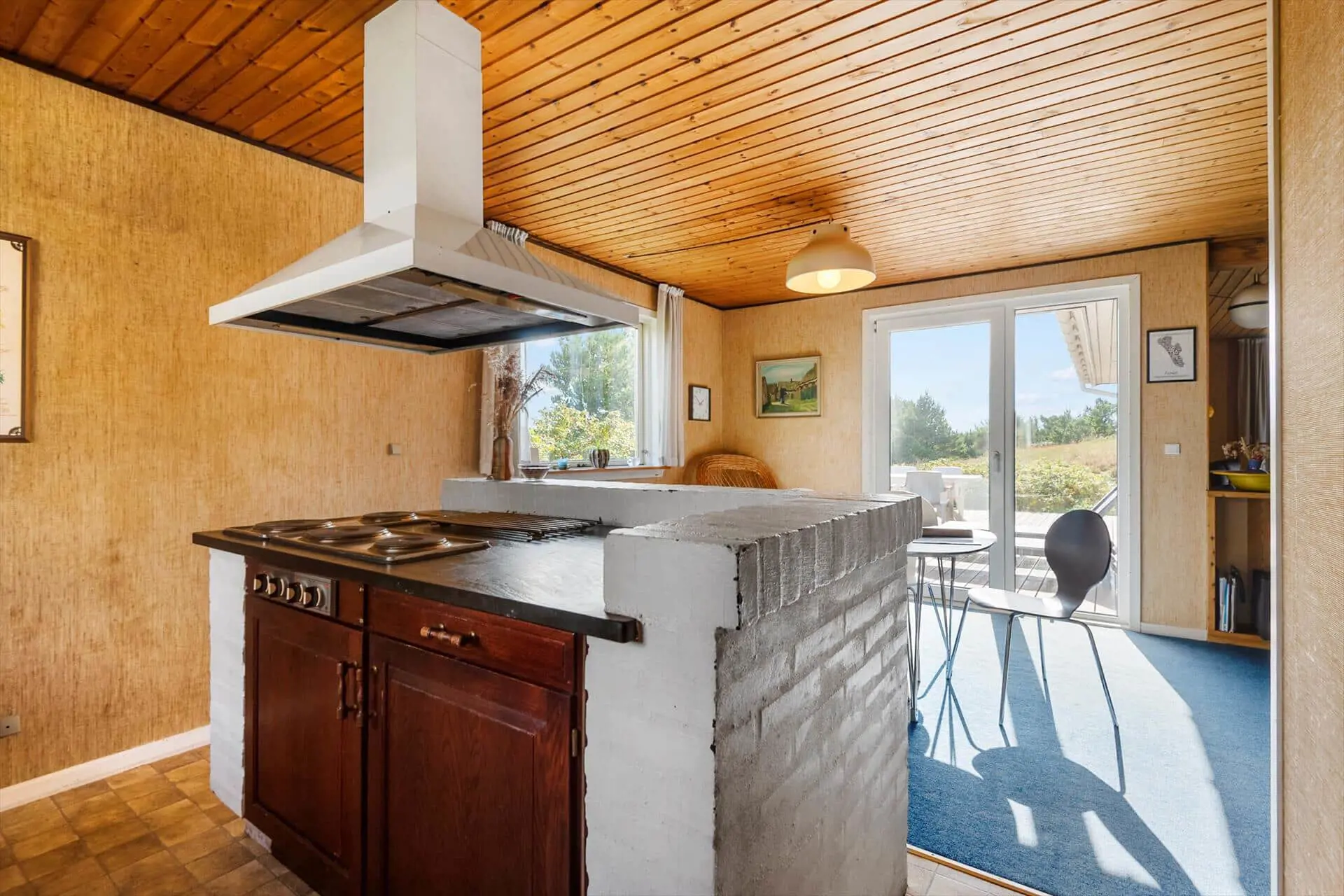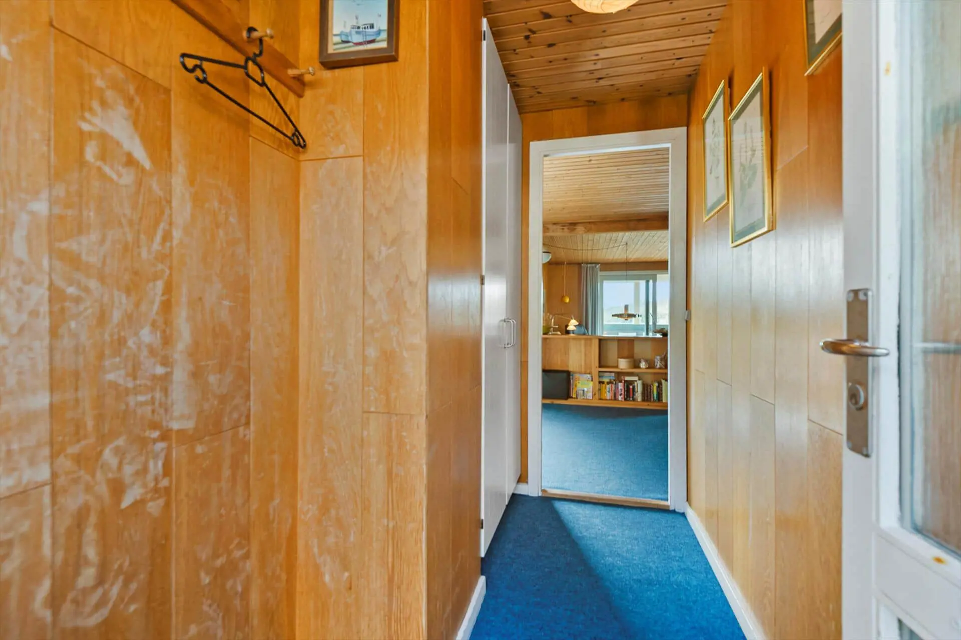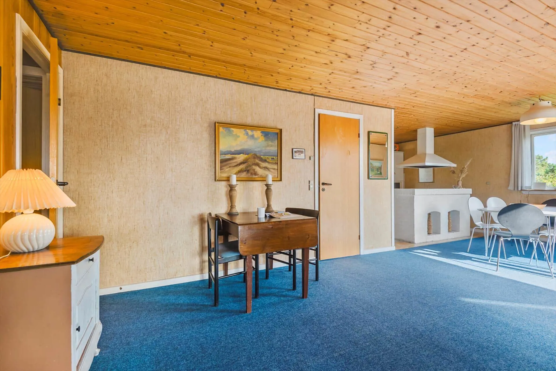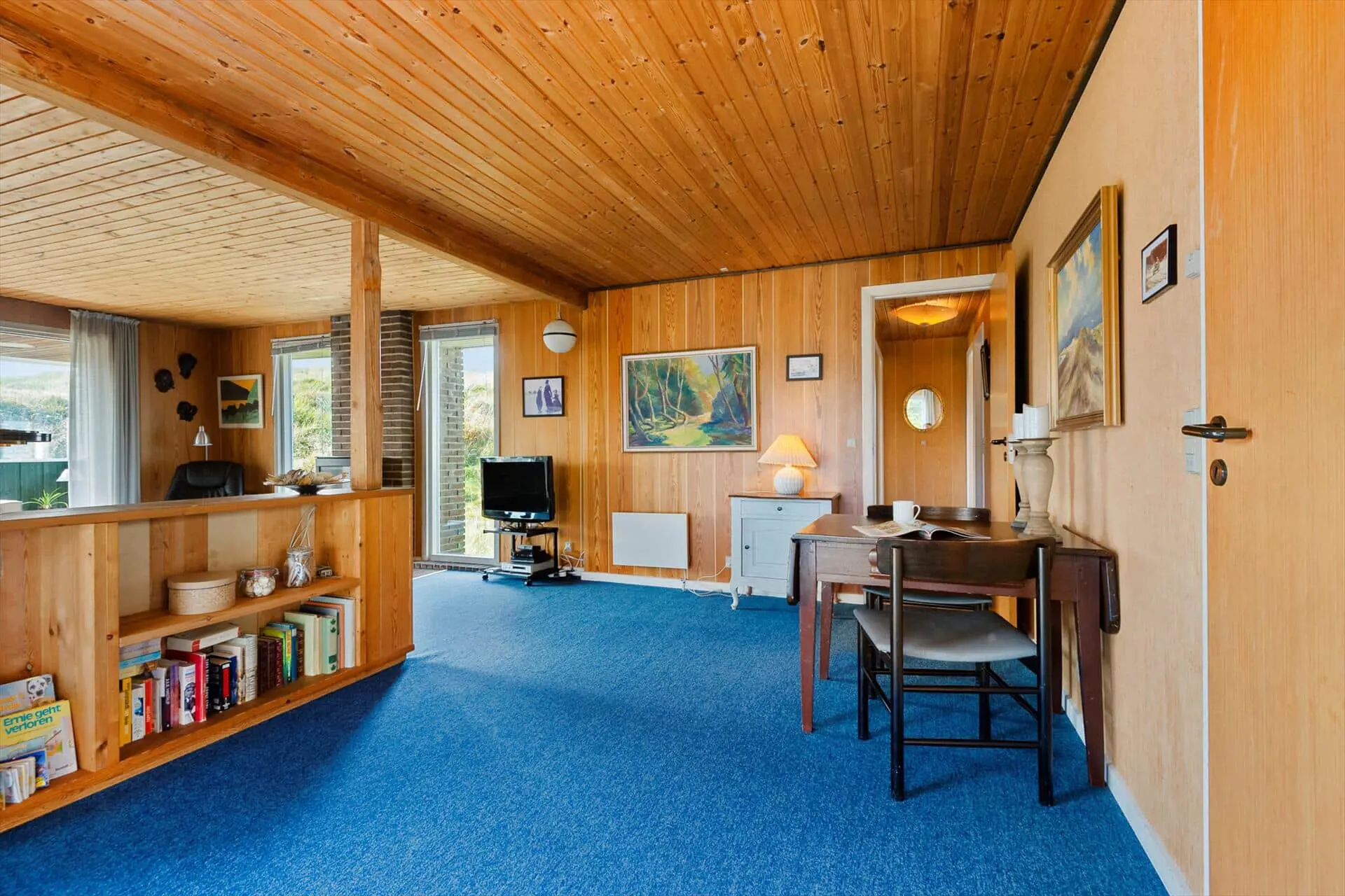 Im Inneren empfängt dich das Ferienhaus mit einer warmen und persönlichen Atmosphäre, die dich vom ersten Moment an mitten ins Herz trifft. Der liebevoll bewahrte, authentische Stil versprüht klassische Ferienhaus-Idylle, und die Räume laden zum Wohlfühlen ein. Der Wohnbereich bildet den natürlichen Mittelpunkt des Hauses – hier vereinen sich Küche, Essplatz und Sofaecke zu einer harmonischen Einheit. Bei einer Tasse Morgenkaffee kannst du den Blick ins Grüne schweifen lassen, während die ersten Sonnenstrahlen durch die Fenster scheinen. Die Küche lädt zum entspannten Kochen mit der Familie ein, und nach dem Essen machst du es dir mit einem guten Buch oder einem Brettspiel so richtig gemütlich. Gegenüber der Haustür – im Durchgang zwischen Haus und Garage – befindet sich ein separater Hauswirtschaftsraum, der zur Garage gehört, aber über einen eigenen Außeneingang verfügt. Hier kannst du bequem dein Fahrrad abstellen und findest Platz für Strandtaschen, Gummistiefel oder Jacken.
