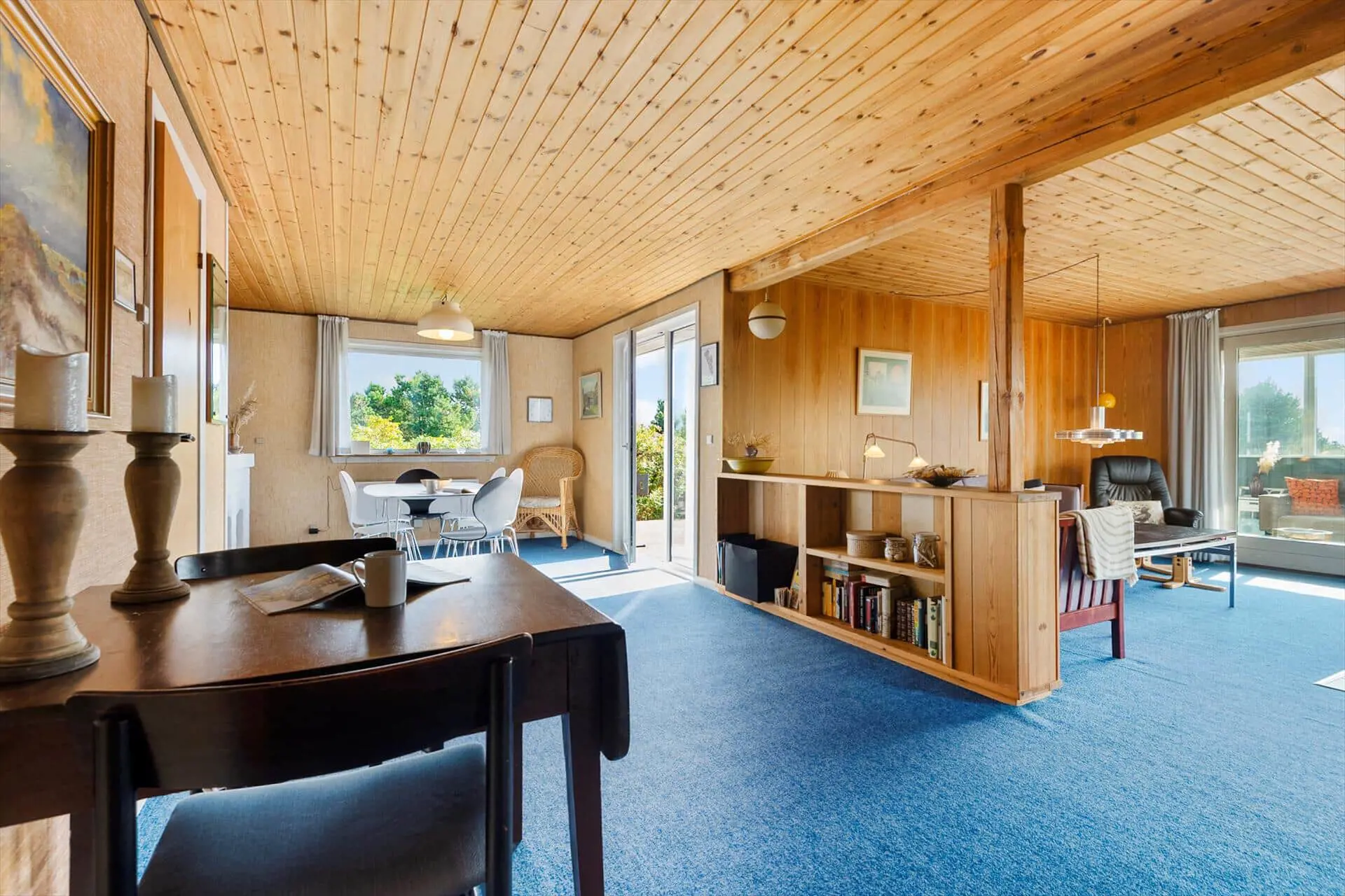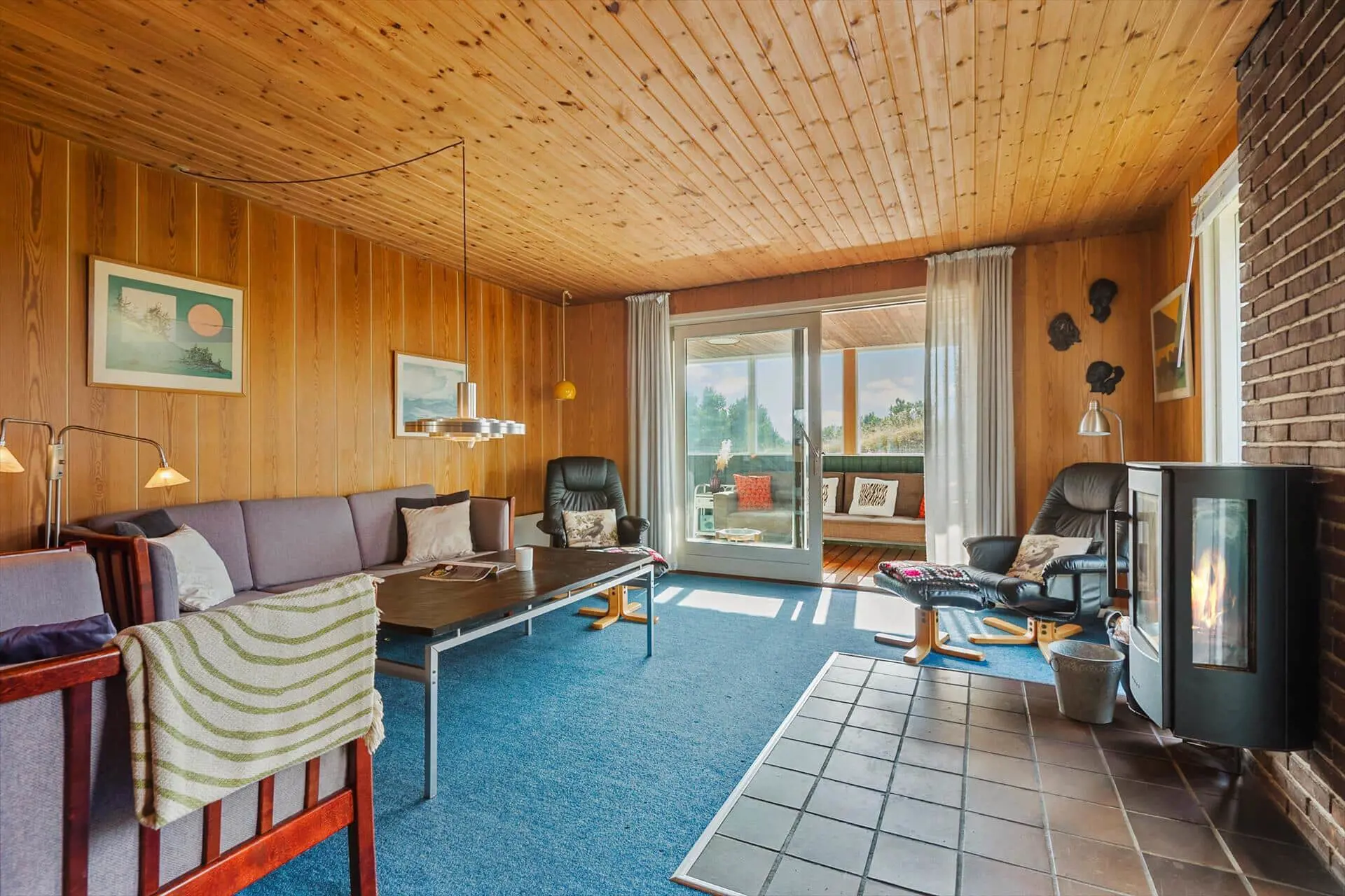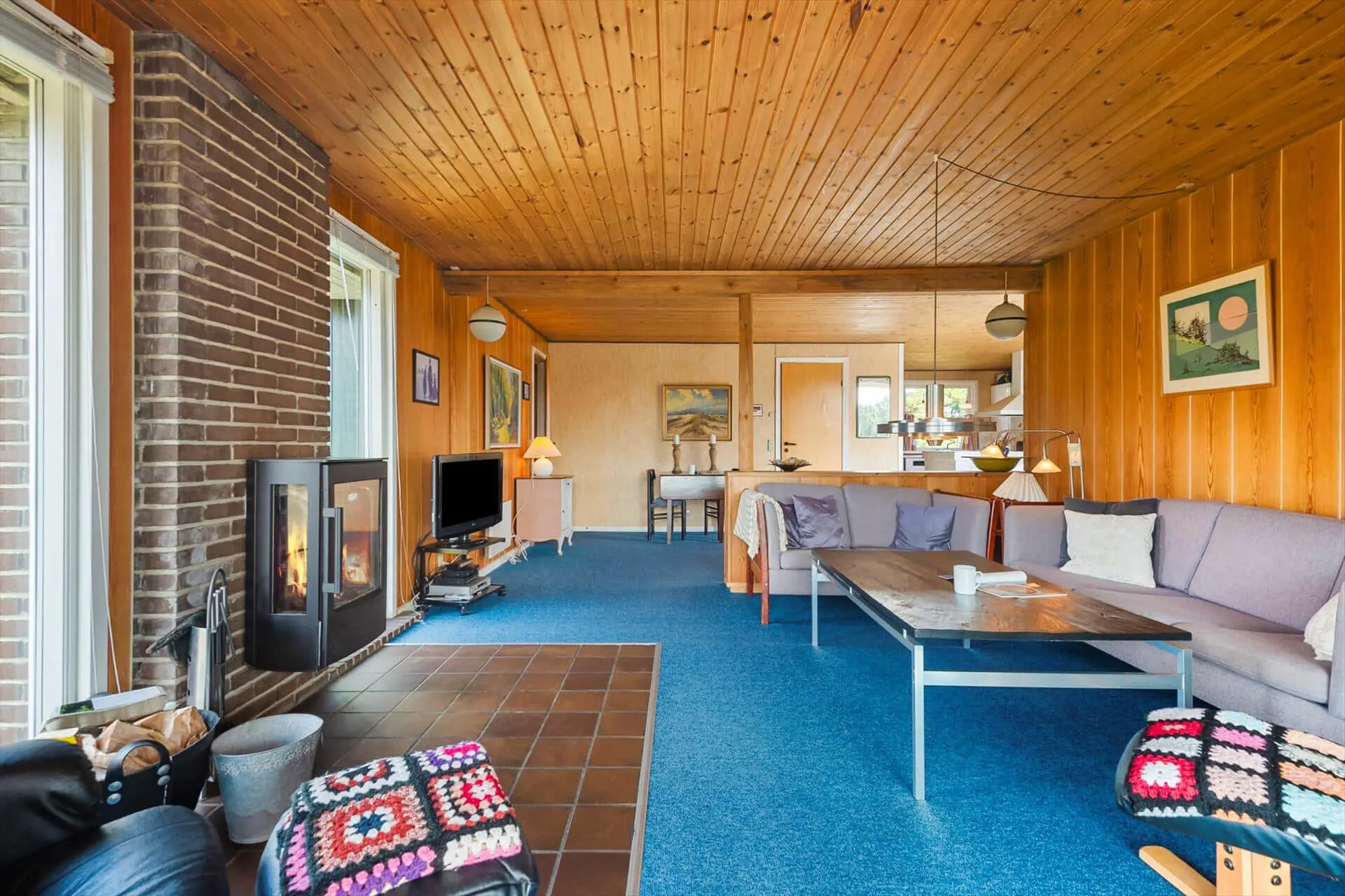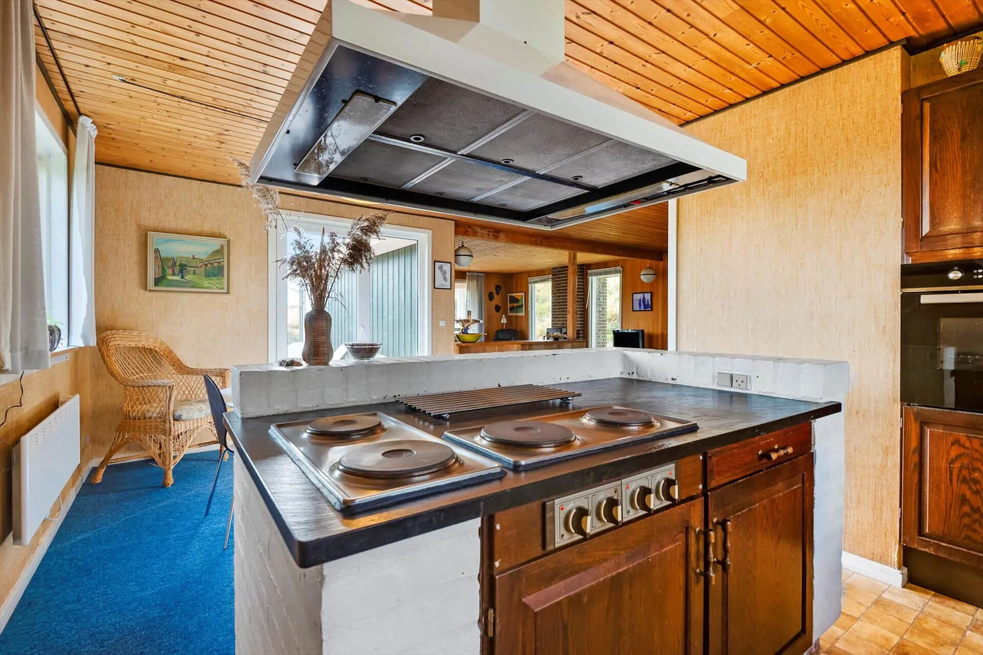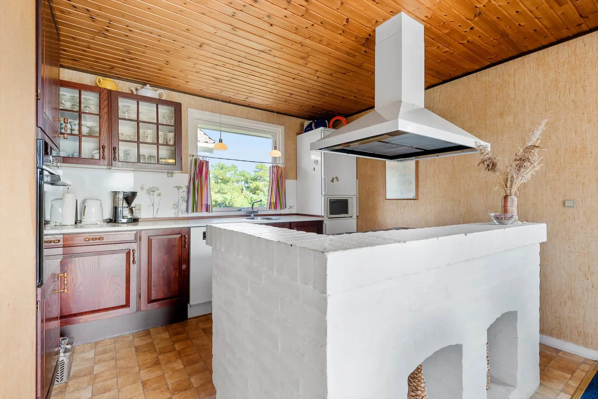 Im Inneren empfängt dich das Ferienhaus mit einer warmen und persönlichen Atmosphäre, die dich vom ersten Moment an mitten ins Herz trifft. Der liebevoll bewahrte, authentische Stil versprüht klassische Ferienhaus-Idylle, und die Räume laden zum Wohlfühlen ein. Der Wohnbereich bildet den natürlichen Mittelpunkt des Hauses – hier vereinen sich Küche, Essplatz und Sofaecke zu einer harmonischen Einheit. Bei einer Tasse Morgenkaffee kannst du den Blick ins Grüne schweifen lassen, während die ersten Sonnenstrahlen durch die Fenster scheinen. Die Küche lädt zum entspannten Kochen mit der Familie ein, und nach dem Essen machst du es dir mit einem guten Buch oder einem Brettspiel so richtig gemütlich. Gegenüber der Haustür – im Durchgang zwischen Haus und Garage – befindet sich ein separater Hauswirtschaftsraum, der zur Garage gehört, aber über einen eigenen Außeneingang verfügt. Hier kannst du bequem dein Fahrrad abstellen und findest Platz für Strandtaschen, Gummistiefel oder Jacken.