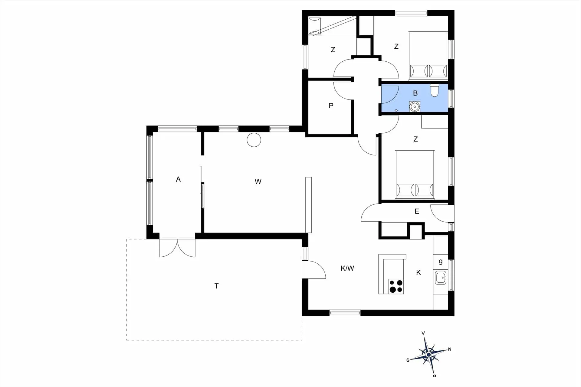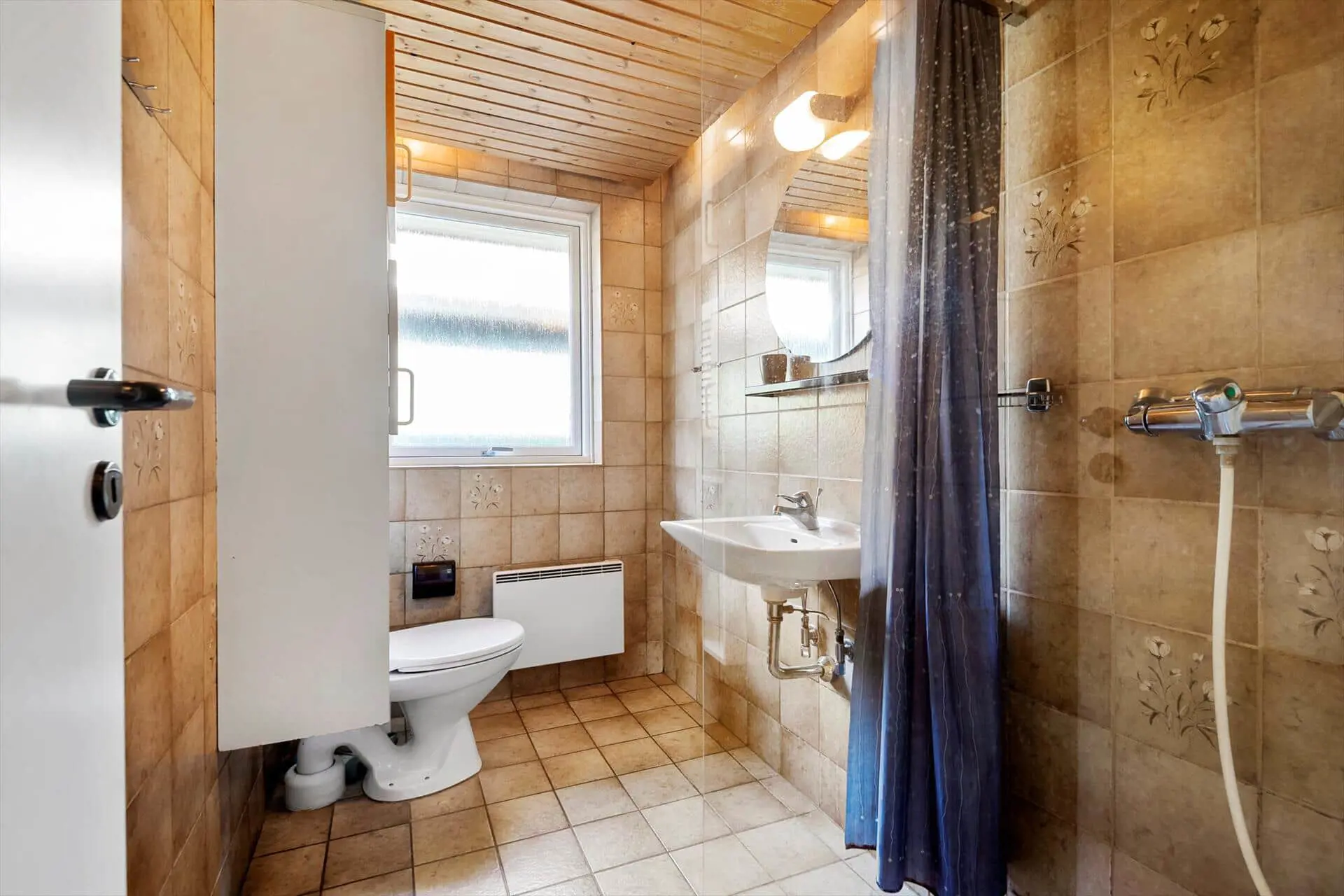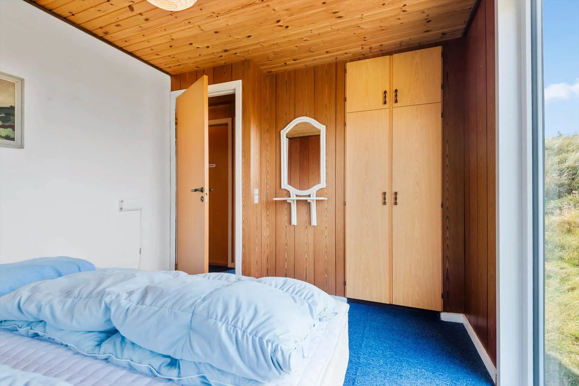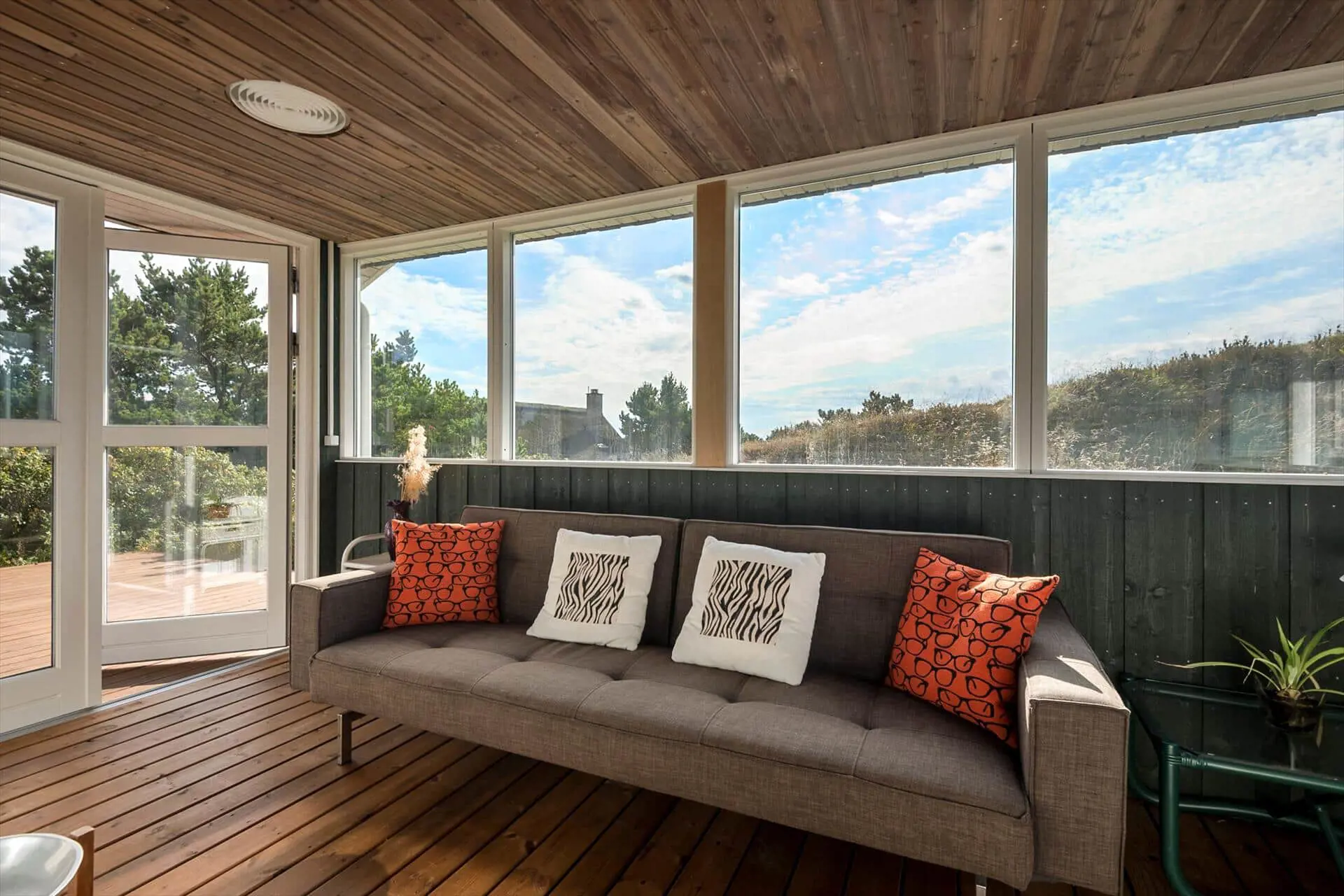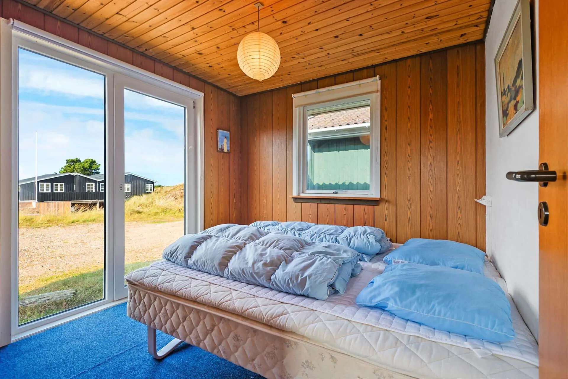 Im Inneren empfängt dich das Ferienhaus mit einer warmen und persönlichen Atmosphäre, die dich vom ersten Moment an mitten ins Herz trifft. Der liebevoll bewahrte, authentische Stil versprüht klassische Ferienhaus-Idylle, und die Räume laden zum Wohlfühlen ein. Der Wohnbereich bildet den natürlichen Mittelpunkt des Hauses – hier vereinen sich Küche, Essplatz und Sofaecke zu einer harmonischen Einheit. Bei einer Tasse Morgenkaffee kannst du den Blick ins Grüne schweifen lassen, während die ersten Sonnenstrahlen durch die Fenster scheinen. Die Küche lädt zum entspannten Kochen mit der Familie ein, und nach dem Essen machst du es dir mit einem guten Buch oder einem Brettspiel so richtig gemütlich. Gegenüber der Haustür – im Durchgang zwischen Haus und Garage – befindet sich ein separater Hauswirtschaftsraum, der zur Garage gehört, aber über einen eigenen Außeneingang verfügt. Hier kannst du bequem dein Fahrrad abstellen und findest Platz für Strandtaschen, Gummistiefel oder Jacken.