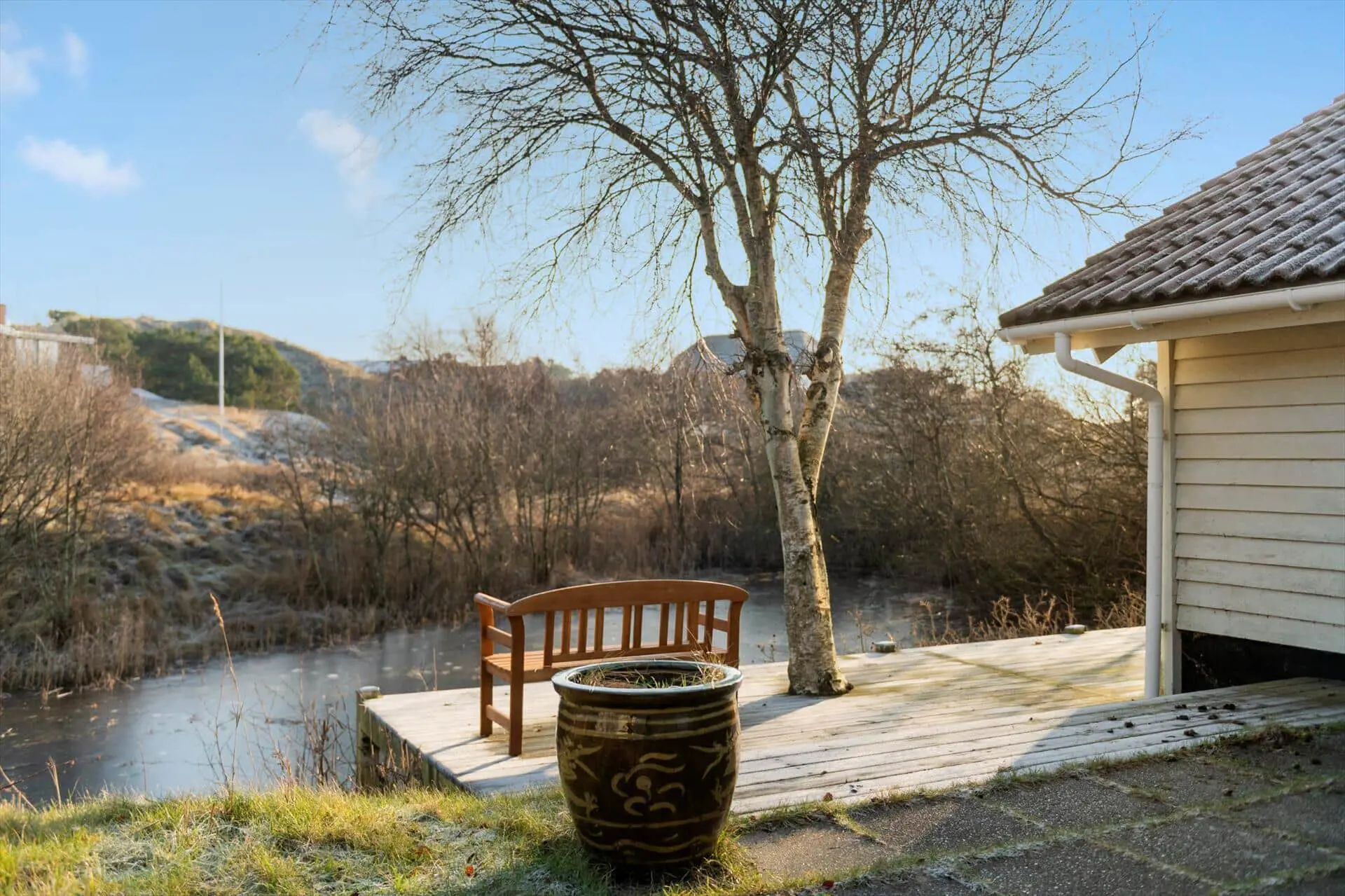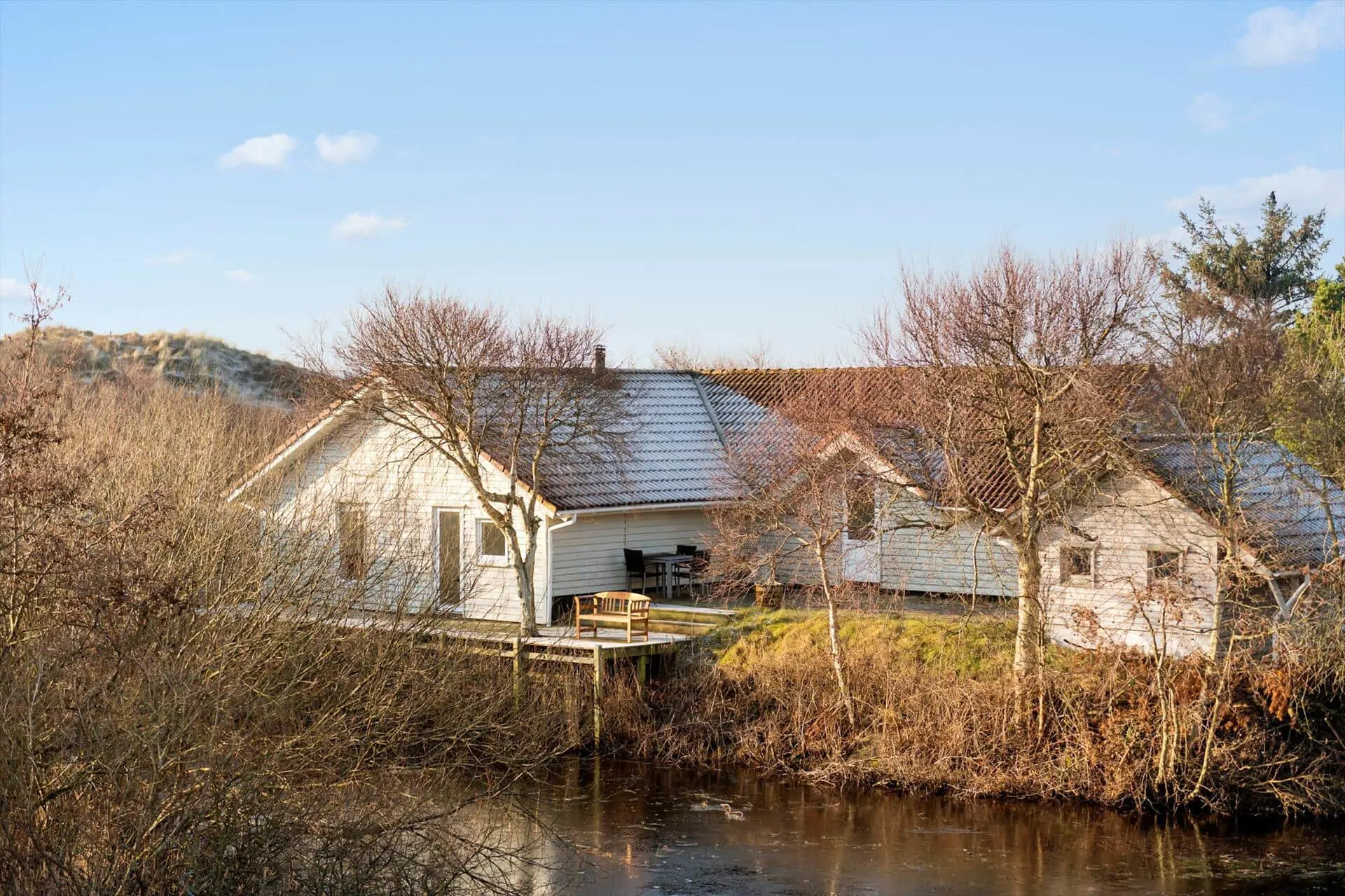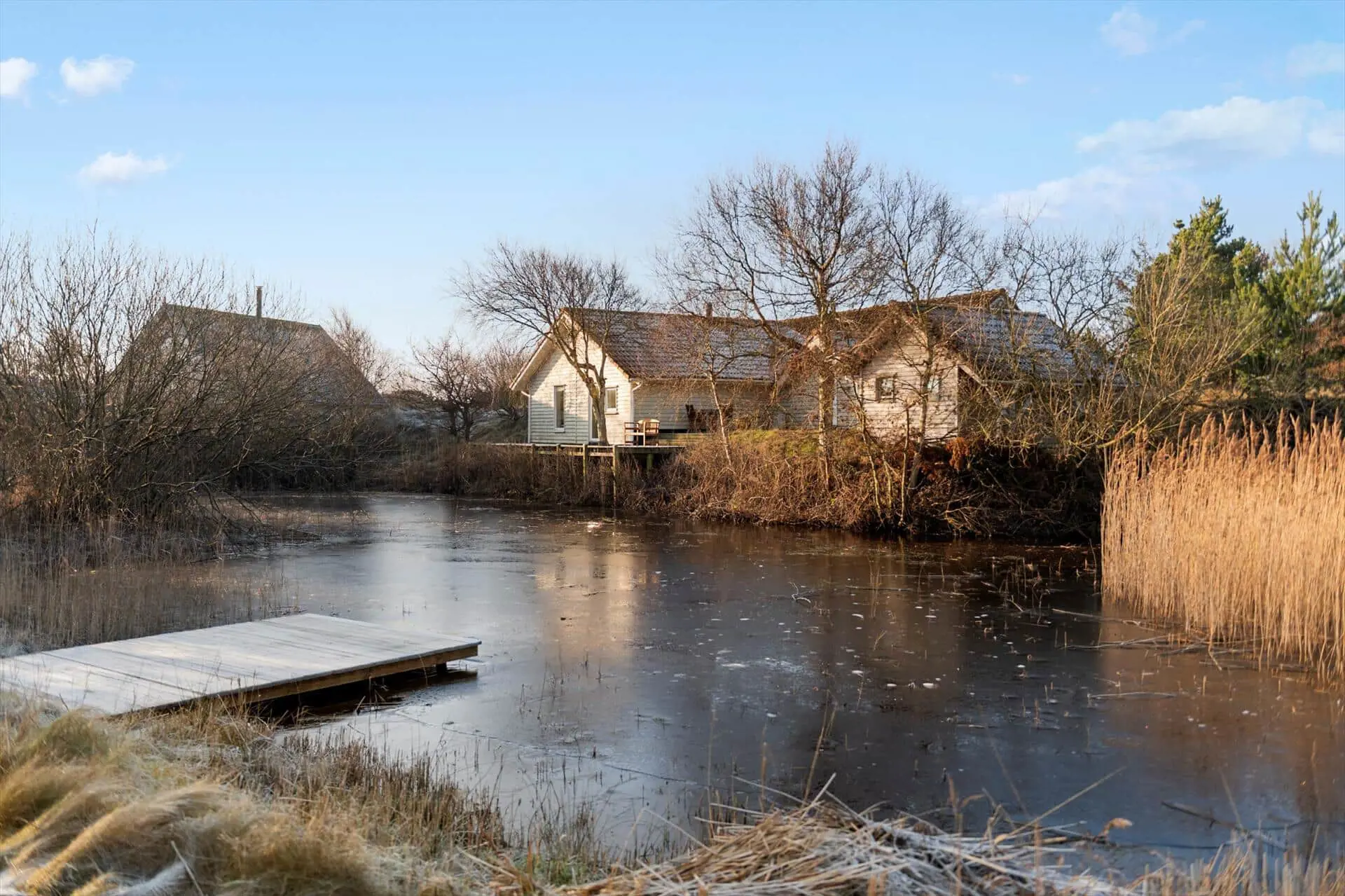 Die Terrassen des Ferienhauses werden schnell zum Mittelpunkt des Urlaubs, sobald das Wetter zu Aktivitäten im Freien einlädt. Hier ist ausreichend Platz für den Morgenkaffee, Mahlzeiten unter freiem Himmel und lange, entspannte Abende. Von der Terrasse aus genießt du den Blick auf den kleinen See, der direkt an das Haus grenzt und eine besonders friedliche Stimmung schafft. Das ruhige Wasser, das rege Vogelleben und die wechselnden Lichtstimmungen bilden eine schöne und natürliche Kulisse für erholsame Urlaubstage. Die Terrassen sind gut ausgerichtet, sodass du im Laufe des Tages sowohl sonnige als auch windgeschützte Plätze findest, und es bietet sich an, Mahlzeiten und ruhige Pausen nach draußen zu verlegen. Hier kannst du die Stille genießen, den Geräuschen der Natur lauschen und spüren, wie sich die Schultern im Einklang mit der Urlaubsstimmung entspannen.