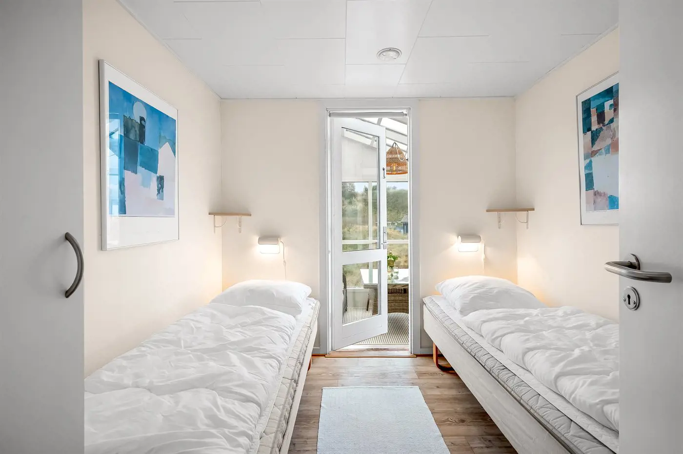 Die Schlafplätze verteilen sich auf 2 Schlafräume. 2 Schlafplätze in einem Doppelbett. 2 Schlafplätze in Einzelbetten.