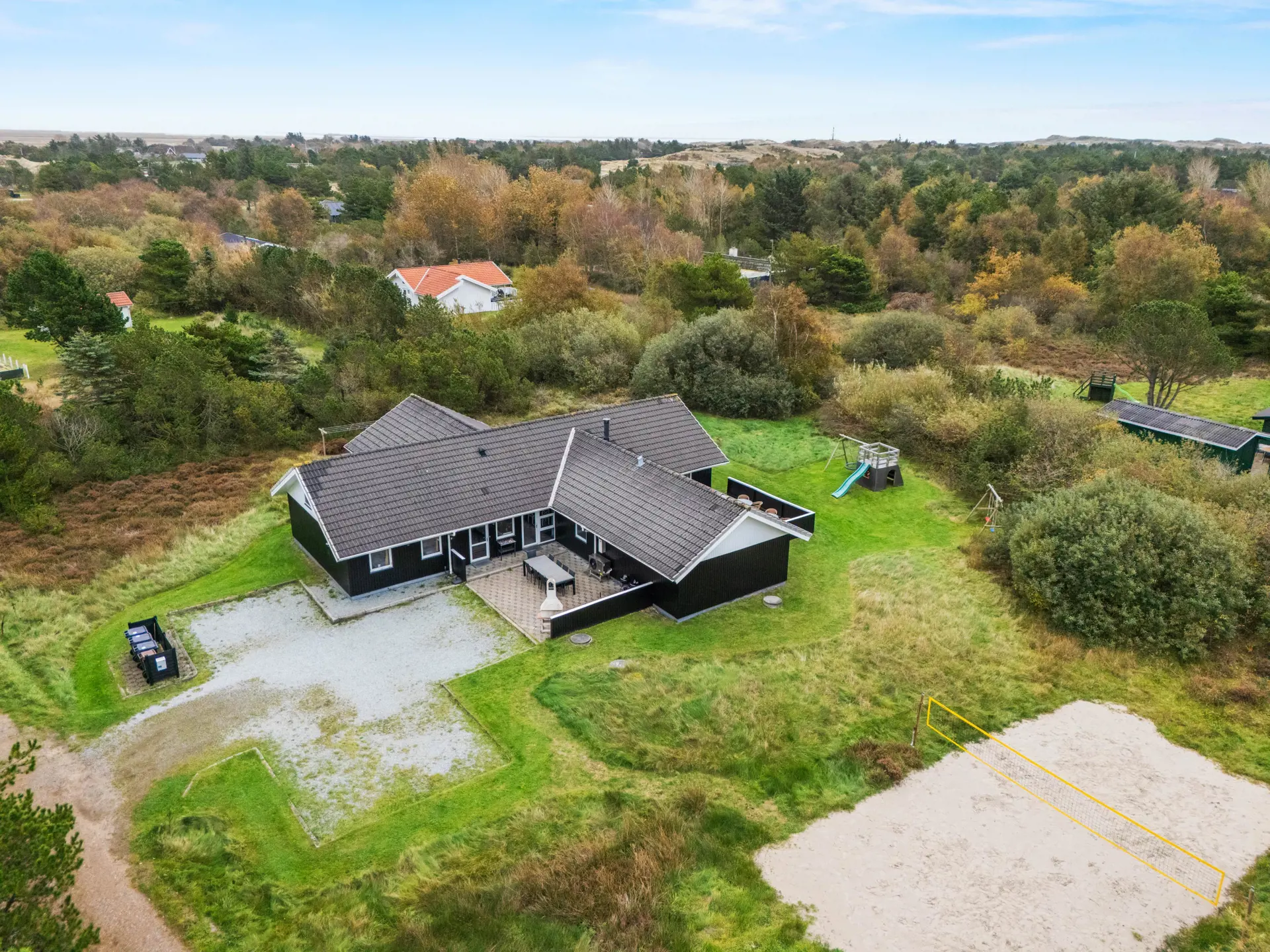 Ein Fernseher und ein Kamin sorgen für Unterhaltung und Gemütlichkeit an kühleren Abenden. Zur Ausstattung gehören auch energiesparende Wärmepumpen, die effizient und energiesparend für Warmwasser und Heizung sorgen, sowie drei Badezimmer mit Fußbodenheizung, die zusätzlichen Komfort bieten. Das Ferienhaus verfügt über sieben gemütliche Schlafzimmer, die ausreichend Privatsphäre für bis zu 14 Personen bieten. Zudem gibt es einen geräumigen Schlafboden der Schlafplätze für 2 Erwachsene oder 4 Kinder bietet.