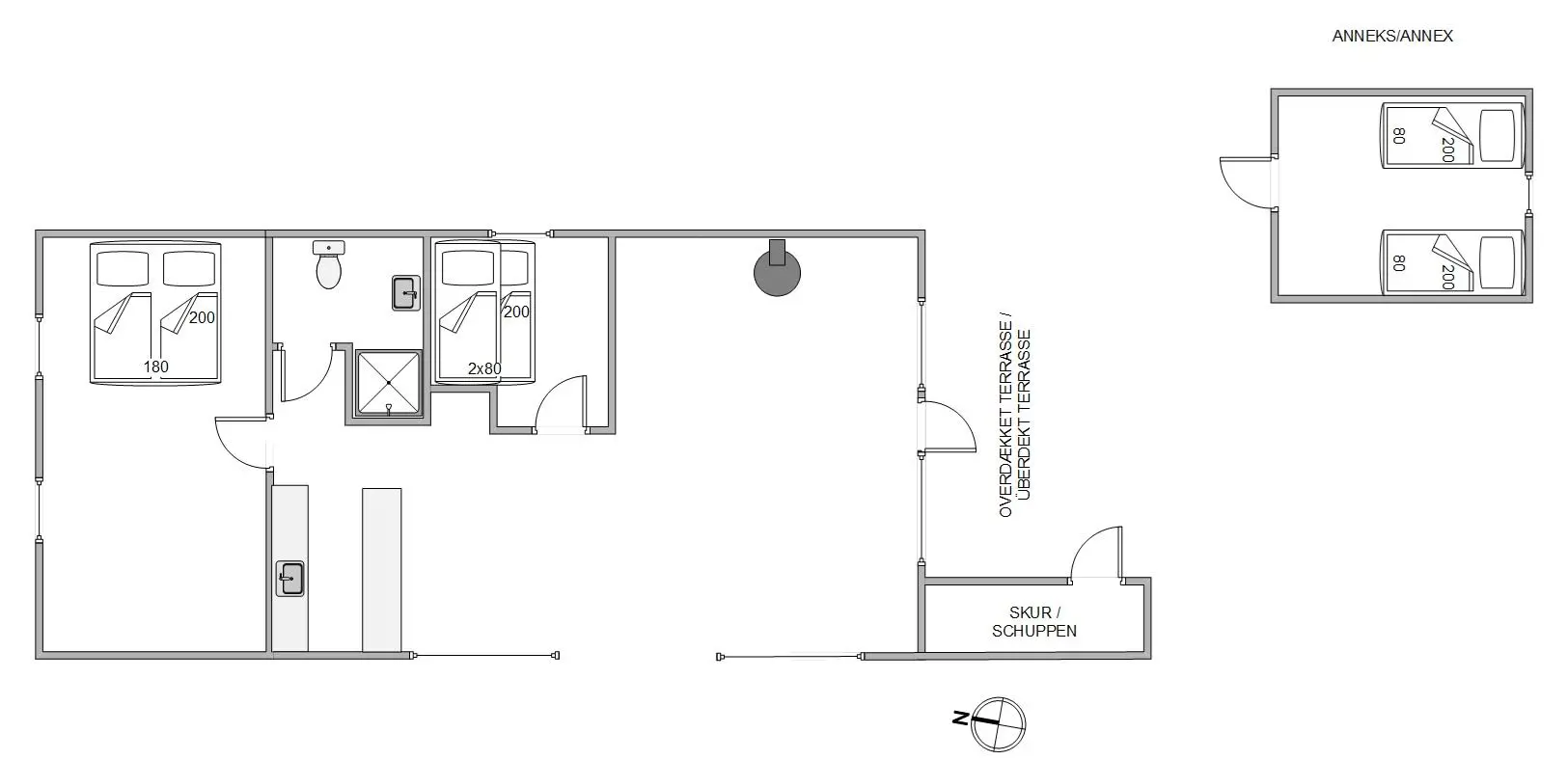 Die gut ausgestattete Küche verfügt über eine Spülmaschine und alle wichtigen Haushaltsgeräte, die ihr für einen entspannten Aufenthalt benötigt. Hier könnt ihr gemeinsam kochen, essen und gesellige Stunden verbringen. Das Ferienhaus bietet zwei Schlafzimmer, jeweils mit einem Doppelbett eingerichtet und darüber hinaus gibt einen Anbau mit 2 Einzelbetten – perfekt für eine kleine Familie oder zwei Paare, die gemeinsam Urlaub machen möchten. Das Badezimmer ist funktional gestaltet und mit Dusche und WC ausgestattet.