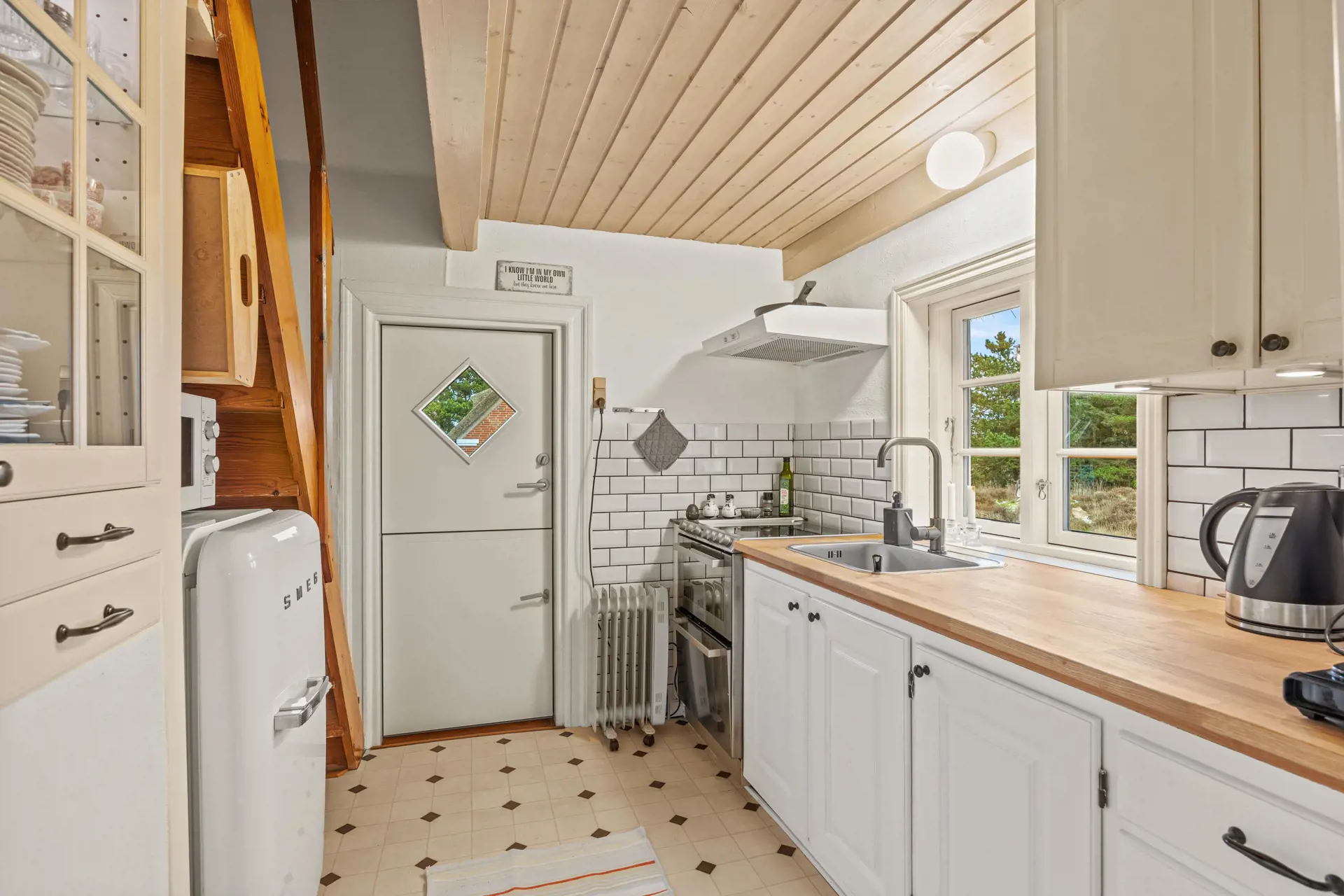 Die kleine, funktional eingerichtete Küche ist praktisch ausgestattet – inklusive Spülmaschine – sodass ihr eure Mahlzeiten ganz unkompliziert zubereiten könnt. Durch das Fenster schaut ihr dabei direkt in die Dünenlandschaft, was besonders morgens oder beim Kochen eine schöne, ruhige Atmosphäre schafft. Am gemütlichen Essplatz könnt ihr den Tag entspannt bei einem Frühstück oder einem gemeinsamen Abendessen ausklingen lassen.