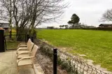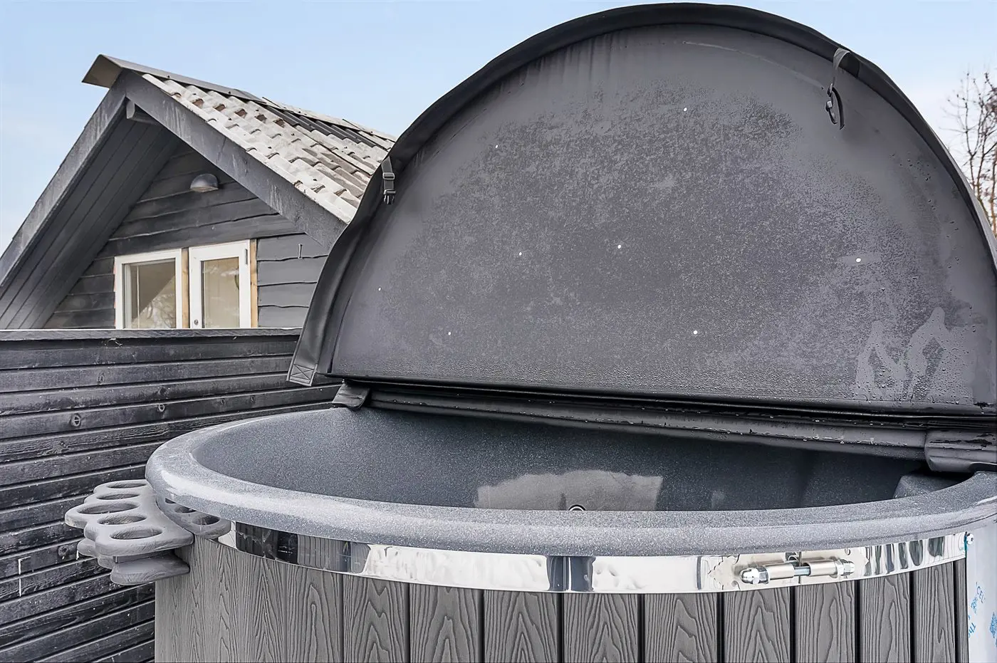 Hinter dem Haus befindet sich ein großes Terrassenareal. Dort gibt es unter anderem einen großen Hot Tub, der das ganze Jahr über nutzbar ist, sowie eine Außendusche im Sommerhalbjahr. Die Terrasse hinter dem Haus ist geschlossen, und von hier aus hast du Zugang zu einer Grünfläche, wo sich nur etwa 100 m vom Haus entfernt ein großer Spielplatz befindet.