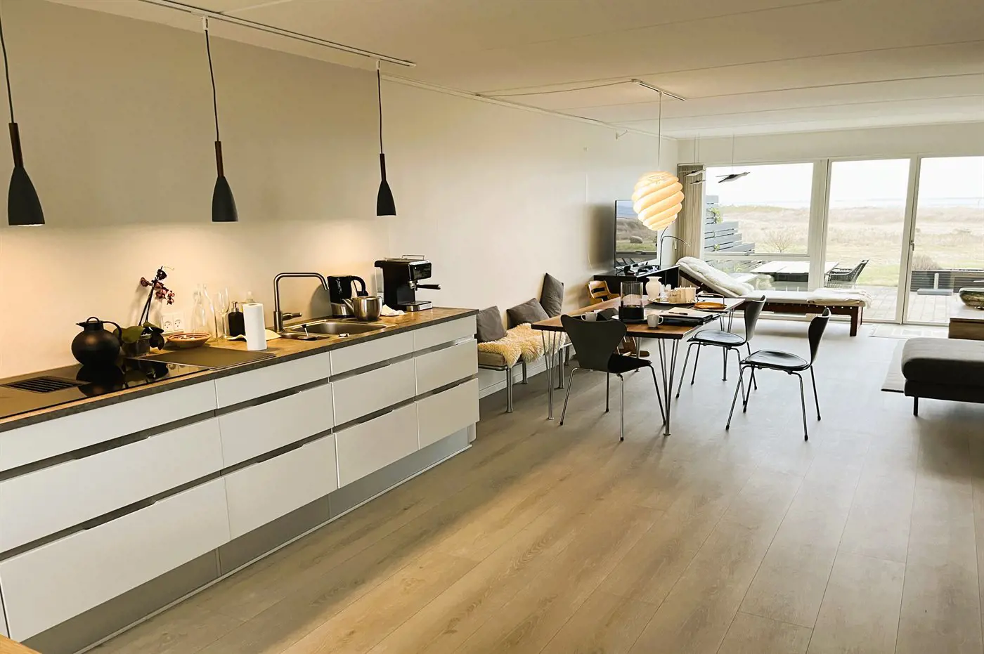 Die Küche ist mit Kühlschrank ausgestattet. Außerdem gibt es 4 Induktions-Kochzonen, Umluftofen, Mikrowelle sowie Geschirrspüler.