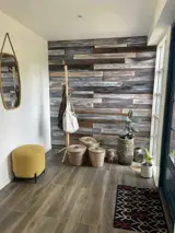 Im Wohnzimmer sorgt der Kaminofen an kühlen Abenden für eine behagliche Atmosphäre, während das Internet einfaches Streamen oder Arbeiten im Urlaub ermöglicht. Die Küche ist praktisch ausgestattet und eignet sich hervorragend für gemeinsame Mahlzeiten. Das Badezimmer bietet eine Badewanne und viel Platz.