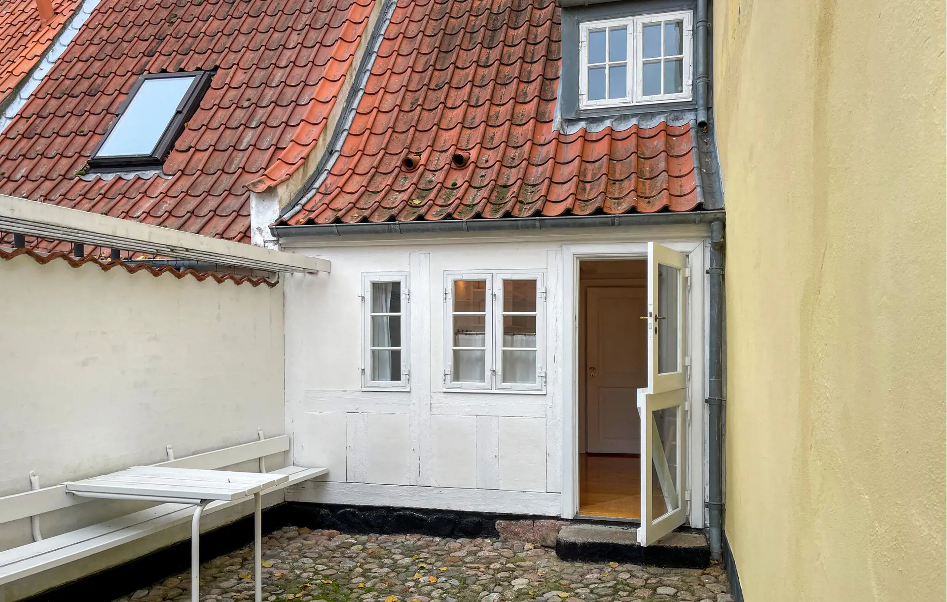 Treten Sie hinaus in den geschützten Innenhof und genießen Sie die ruhige Atmosphäre. Die weißen Fassaden und die Pflastersteine verleihen dem Außenbereich einen traditionellen Charme. Nutzen Sie die lange Sitzbank für entspannte Stunden im Freien oder verweilen Sie im schmalen Gartenbereich hinter dem Haus, der von Holzzäunen umgeben ist.