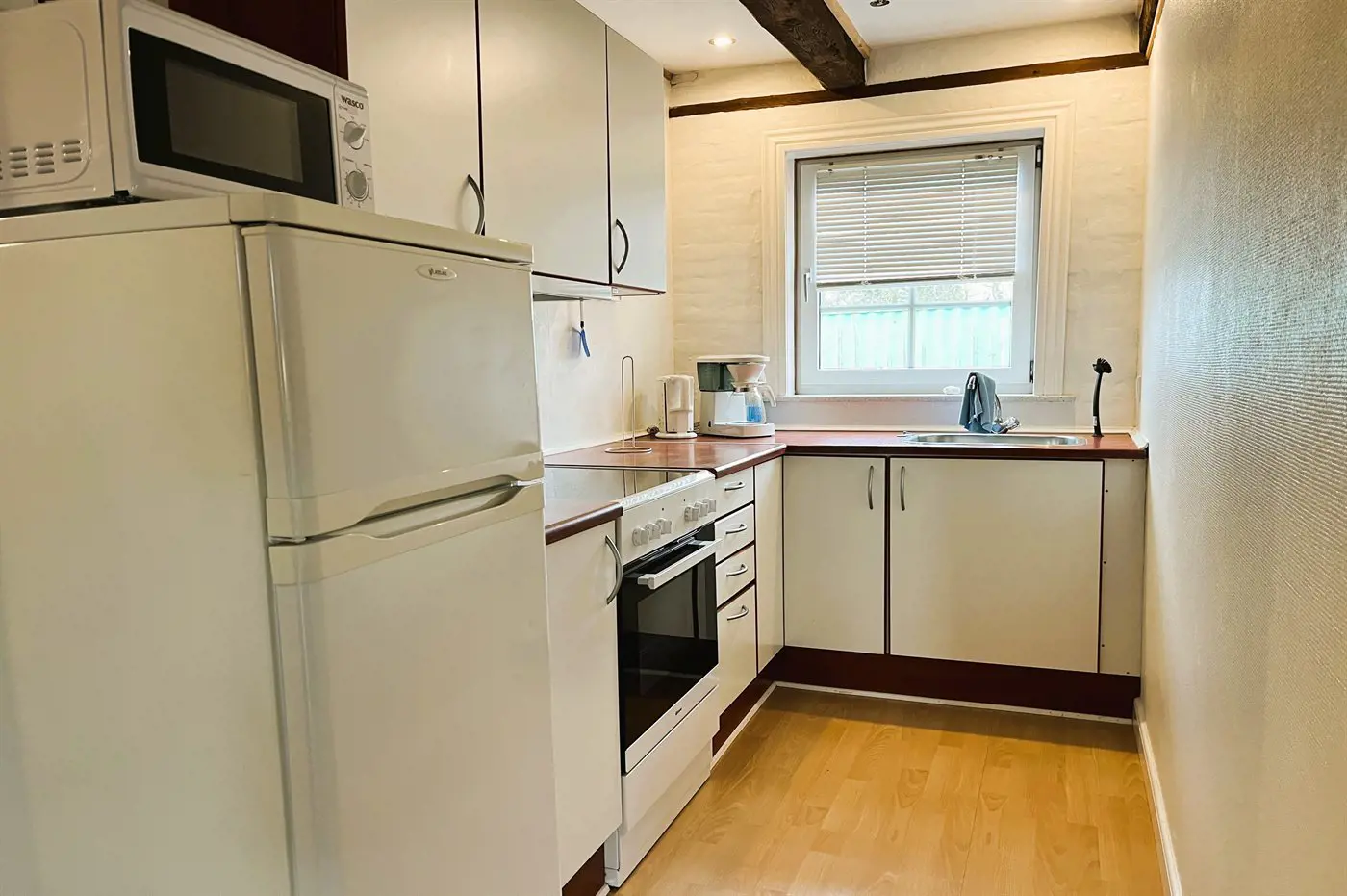 Die Küche ist mit Kühlschrank ausgestattet. Außerdem gibt es 4 Keramik-Kochfelder, Umluftofen, Mikrowelle.